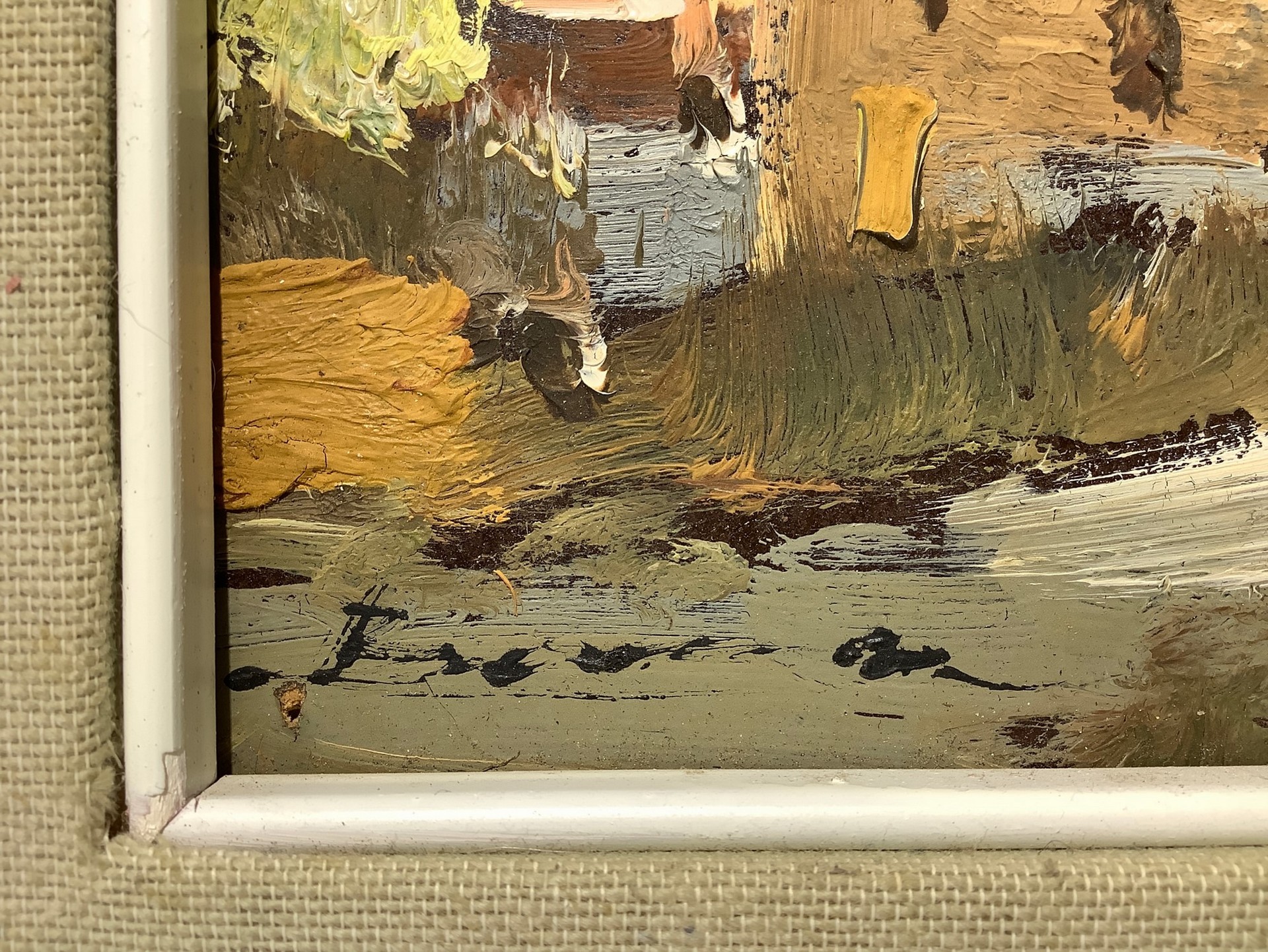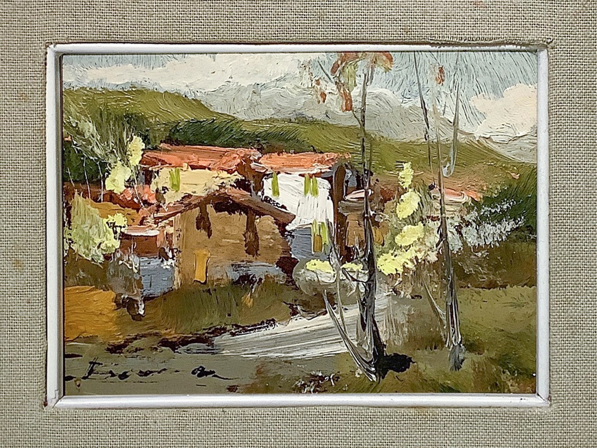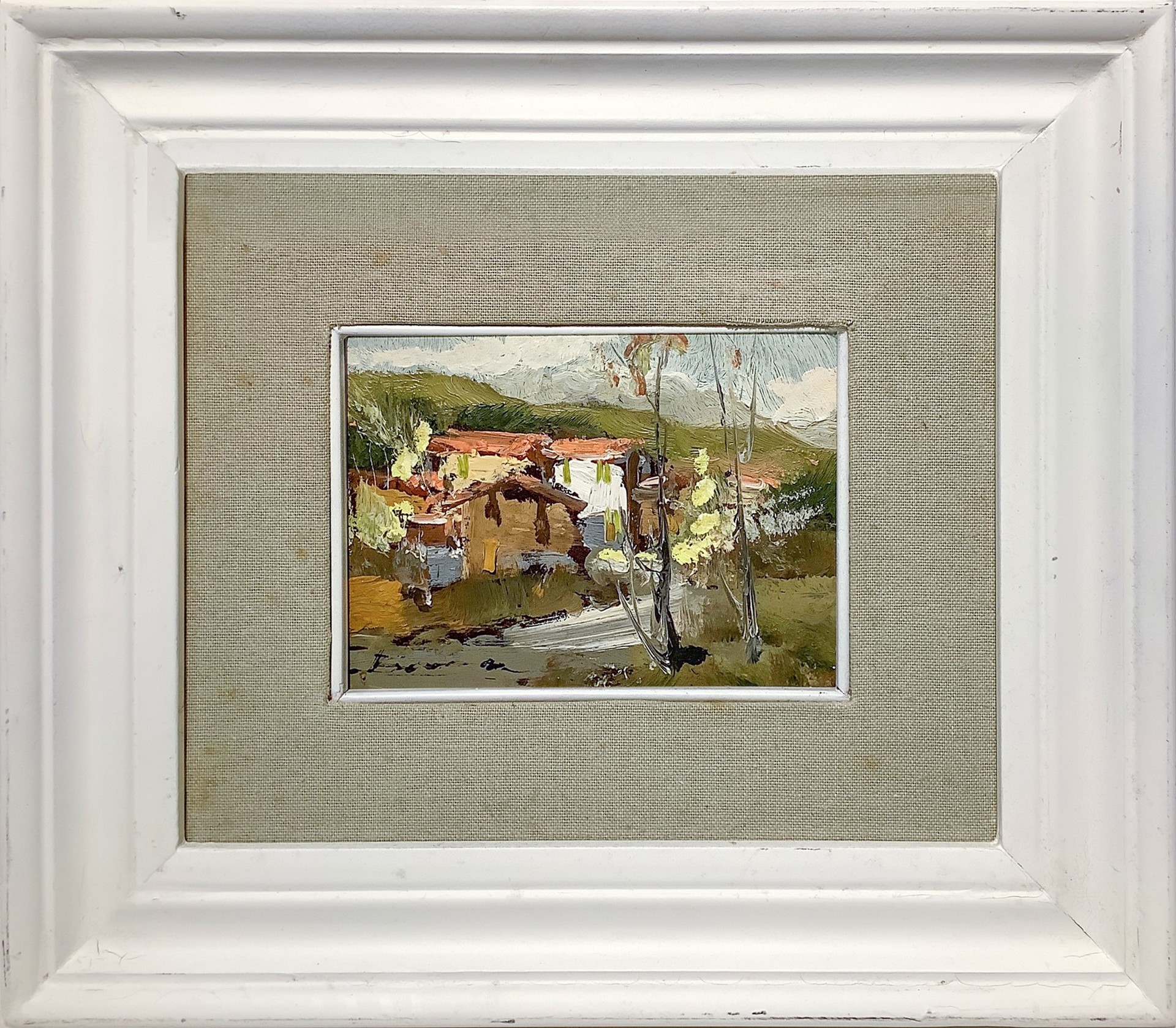 Case in campagna, 20th century 13x18 cm. In cornice: 33x 37,5 cm Dipinto ad olio su cartone telato