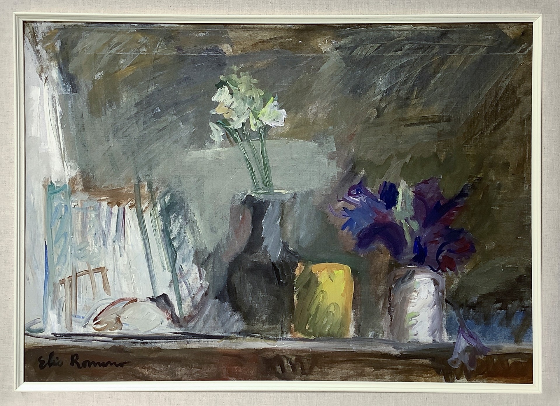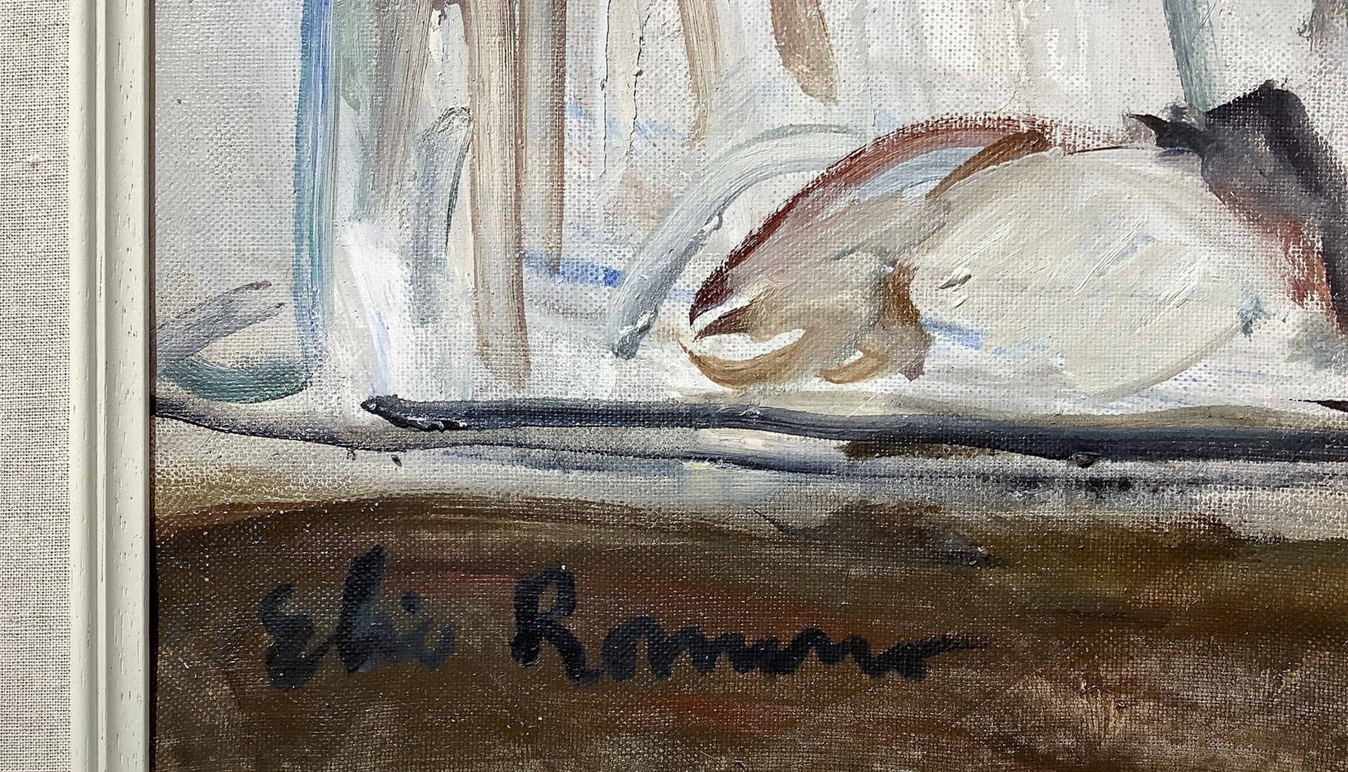 Elio Romano nasce a Trapani ma si trasferisce presto a Catania e diventa apprendista del pittore locale Saro Spina. Nel 1928 studia a Roma alla Scuola libera di nudo e l’anno dopo si iscrive all’Accademia di Belle Arti di Firenze. Diventa allievo di Felice Carena e suo assistente alla fine degli studi. Importante è l’incontro con Giorgio Morandi, altro insegnante dell’Accademia che frequenta e il cui metodo di osservazione diventa un punto fermo nell’arte di Elio Romano. Dopo il corso di scultura che frequenta all’Accademia anche la sua pittura assume un forte senso di plasticità. Ritorna a Catania in maniera definitiva dopo che il suo studio a Firenze viene bombardata. Nella sua terra di origine insegna all’Accademia di Belle Arti di Catania e non smette di dipingere fino alla fine dei suoi giorni. Il suo stile parte dall’Impressionismo ma ha un’evidente tendenza alla struttura realistica. Firmato in basso a sinistra Elio Romano.