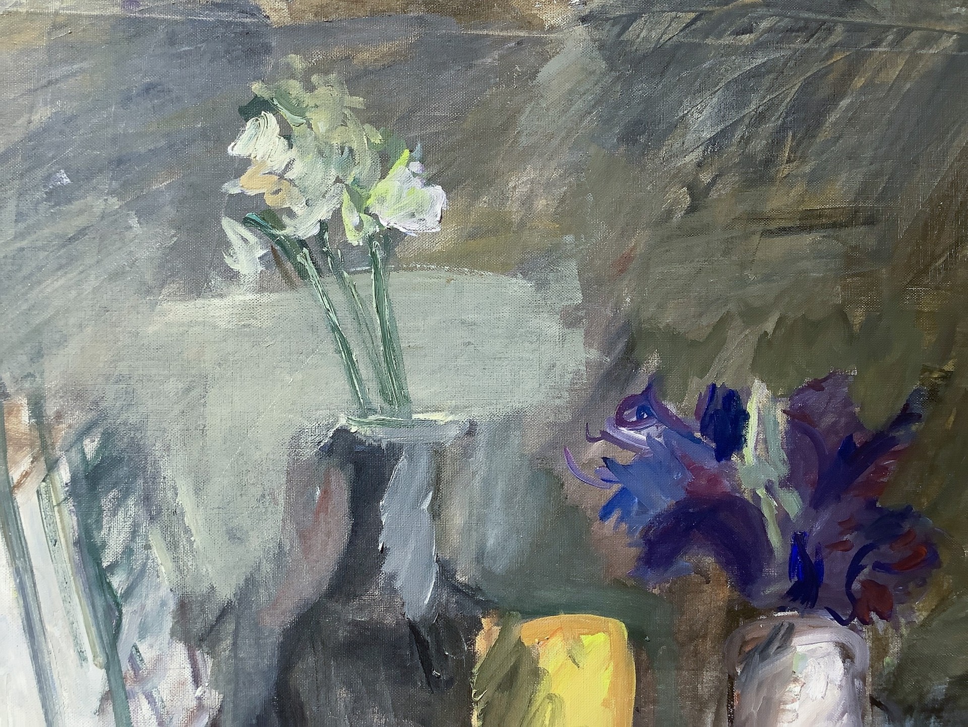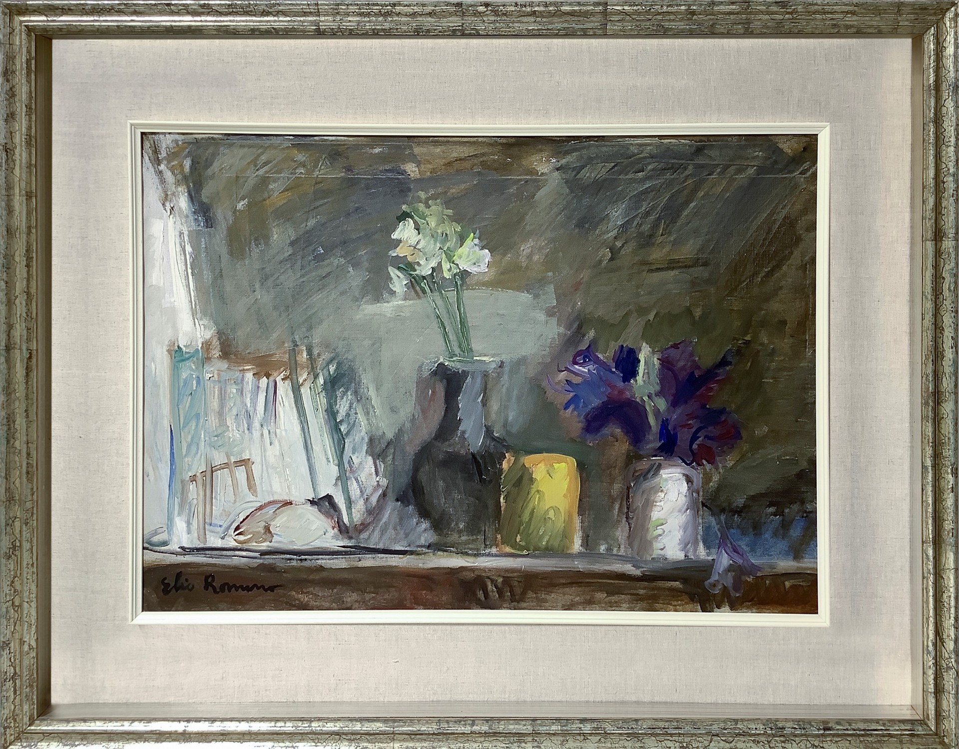 Romano, Elio (Trapani 1909-Catania 1996) - Natura morta di vasi con fiori 50x70 cm, in cornice 75x95 cm Dipinto a olio su tela applicata a masonite