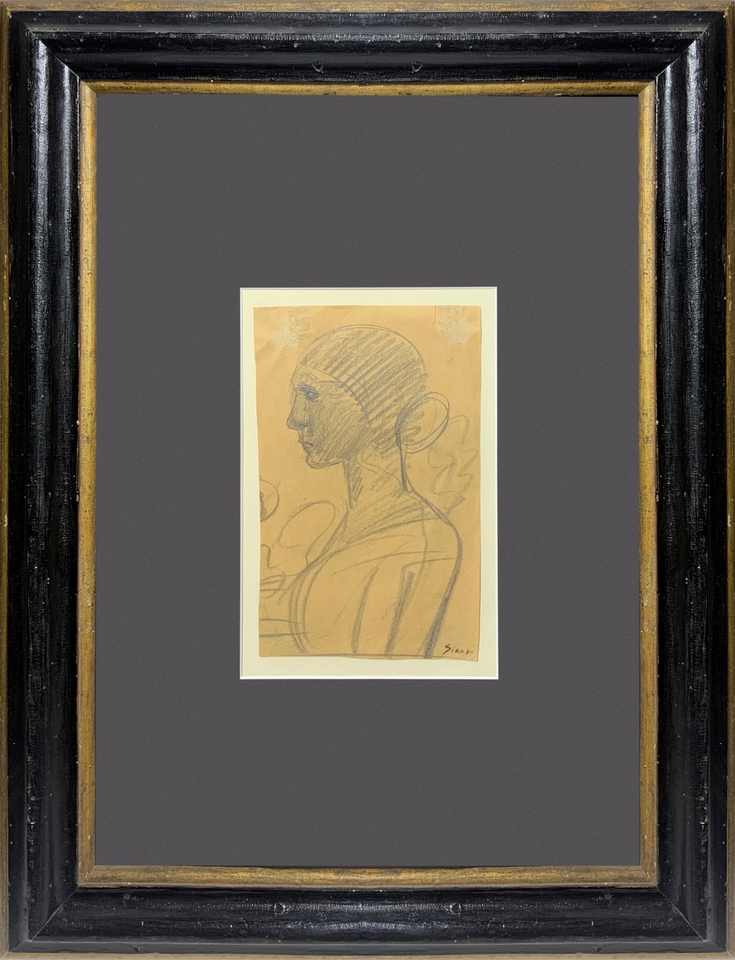 Un'arte di sintesi e di semplificazione estrema”, con queste parole Margherita Saffatti definiva il rigore artistico espresso da Mario Sironi nel 1916, anni prima della sua adesione alla Repubblica di Salò e a quei valori che, in seno alla caduta del regime fascista, verranno a disfarsi nell’animo dell’artista, con la conseguente emersione di quel senso di vuoto che permea le opere del periodo.                                    La traccia del contenitore grafico è immediata e si risolve in un tentativo chiaroscurale sul profilo della donna, il cui volto è pervaso da una evidente aura di malinconia.
