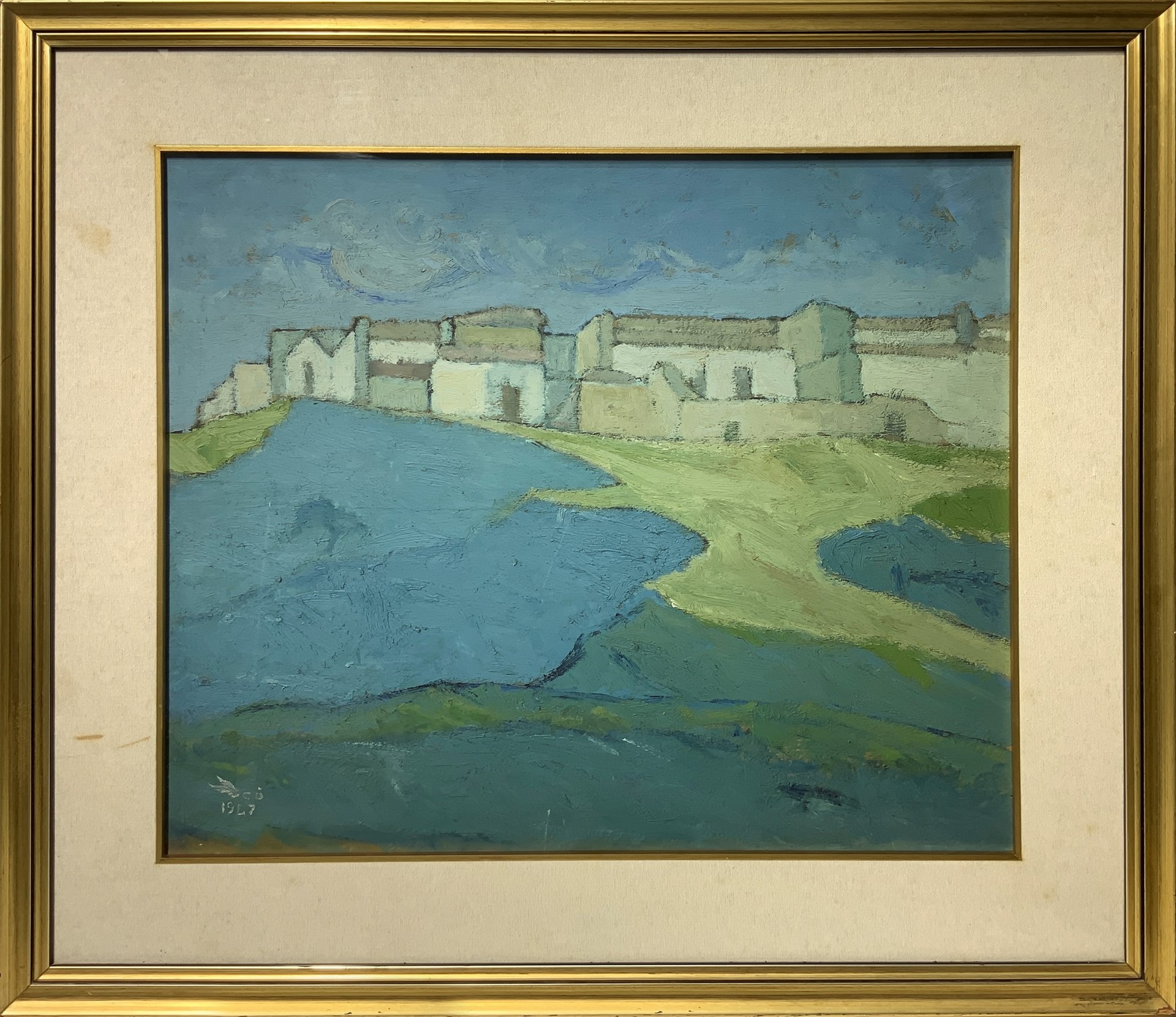 Alicò, Giovanni (Catania 1906-Milano 1971) - Paesaggio con case, 60's Cm 55x60, in cornice 76x85 Dipinto ad olio su tela