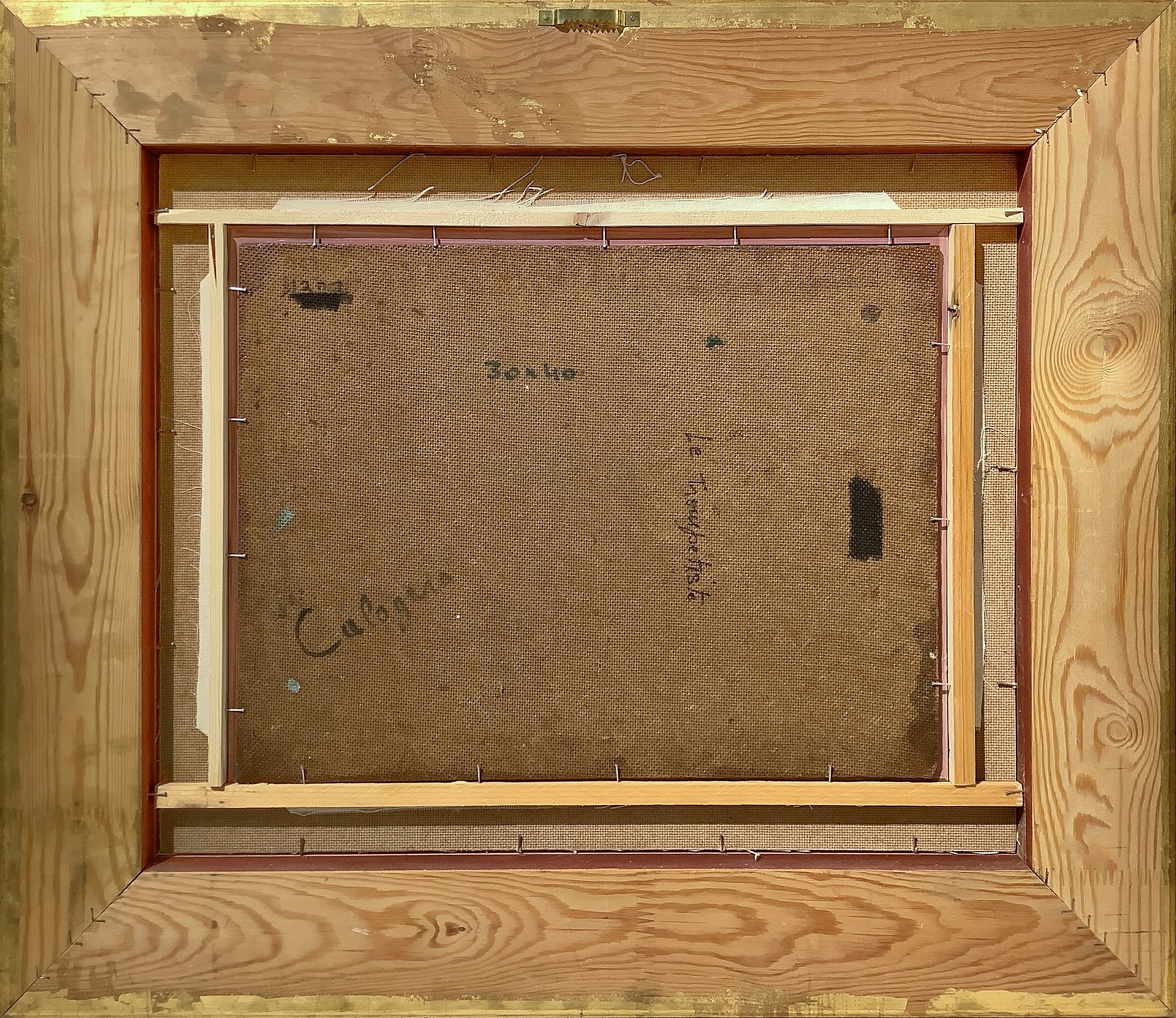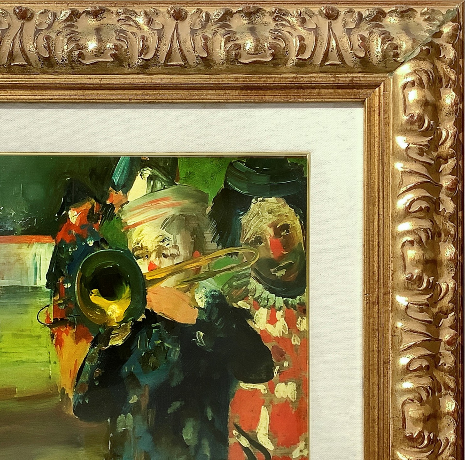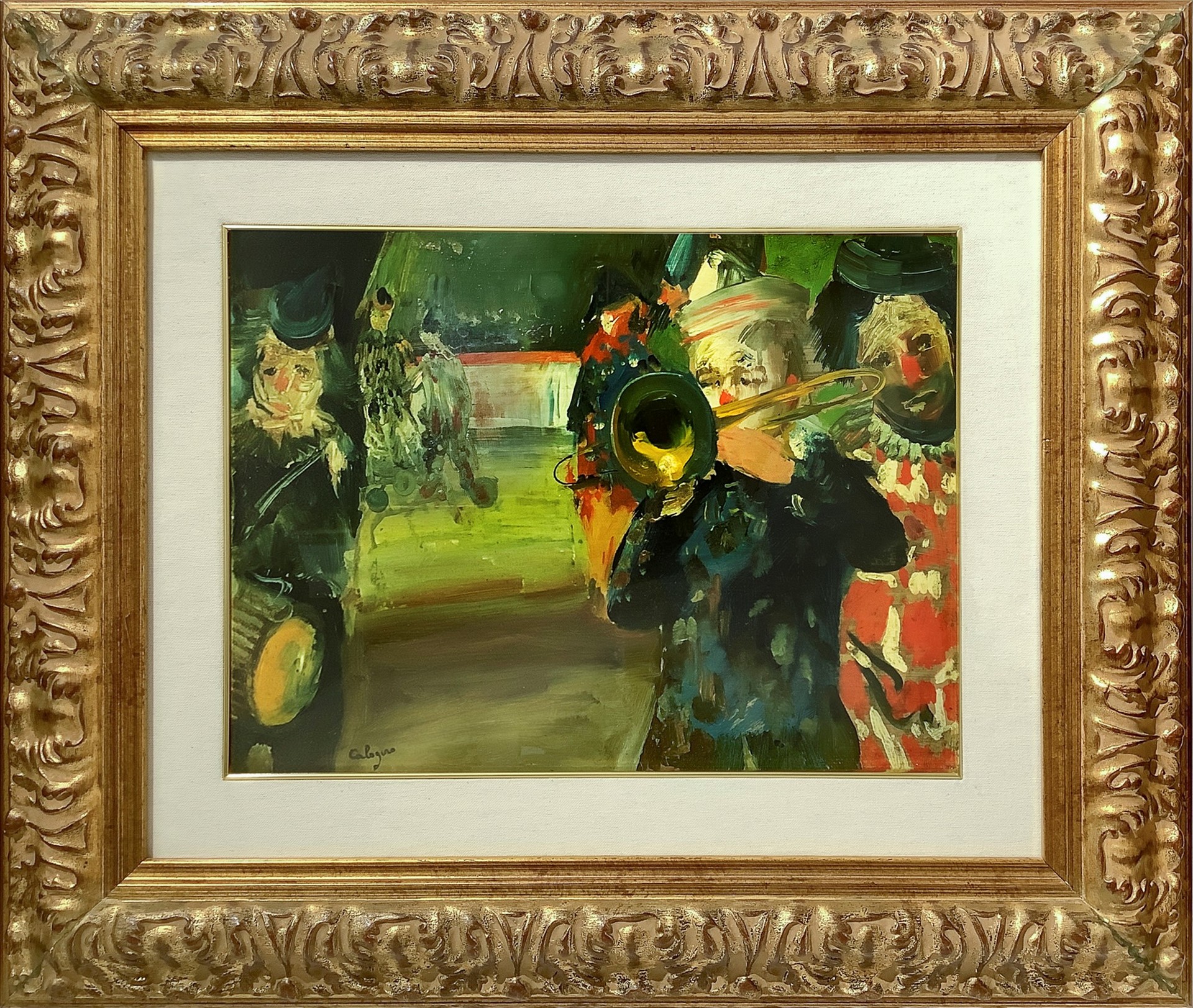 Calogero, Jean (Catania 1922-Acicastello 2001) - Le trompetiste, 1953 Cm 30x40, in cornice 55x66 cm Dipinto ad olio su tela Firmato al fronte in basso a sinistra e titolato e firmato al retro. Autentica dell'archivio Generale dell'opera di Jean Calogero N.j.4.020-763-C