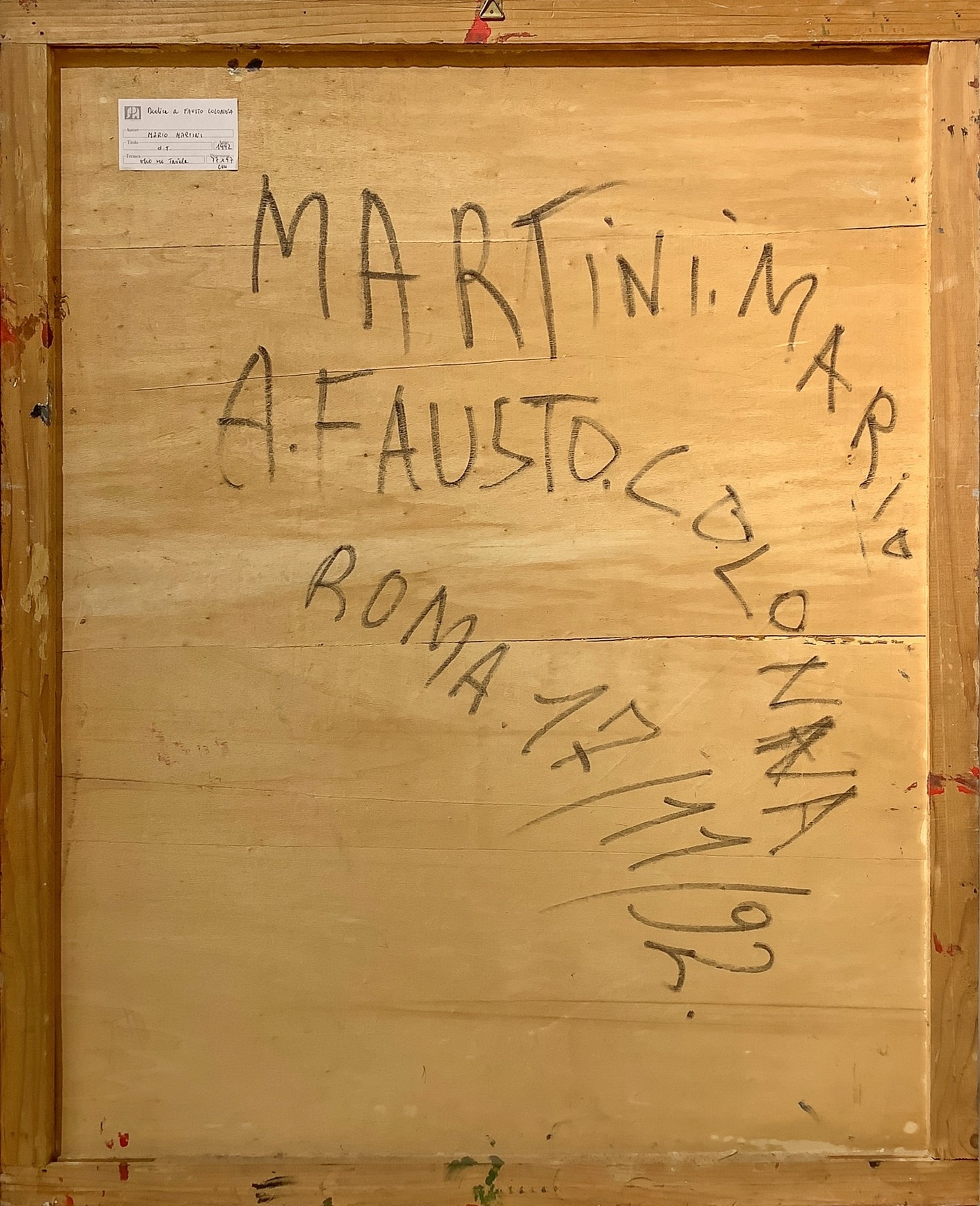 Martini, Mario (Roma 1931-Roma 2007) - Senza titolo, 1992 cm 97x77 Dipinto ad olio su tavola Firmato e datato al fronte, firmato e datato al retro , dedica al Principe Fausto Colonna. Autentica della Catania Art Gallery su fotografia.