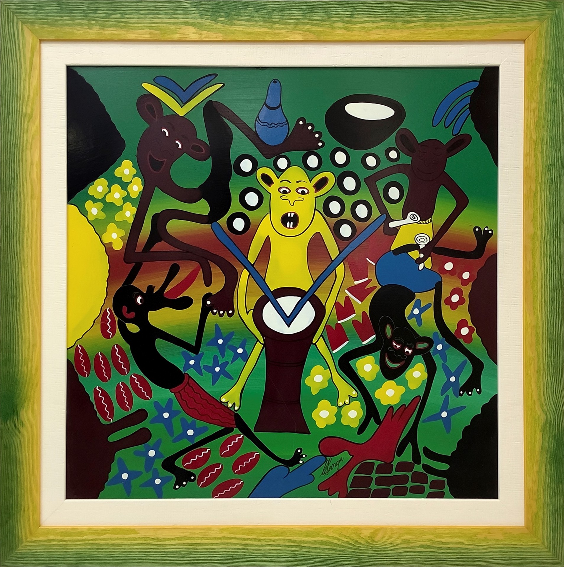 George, Lilanga (Kikwetu 1934-Dar es Salaam 2005) - Senza titolo, 20th century 61x61 cm, in cornice 78x78 cm Dipinto a olio su faesite Firma in basso al centro. Autentica su fotografia. C.A.P.T. Felix Lorenz, Germania.