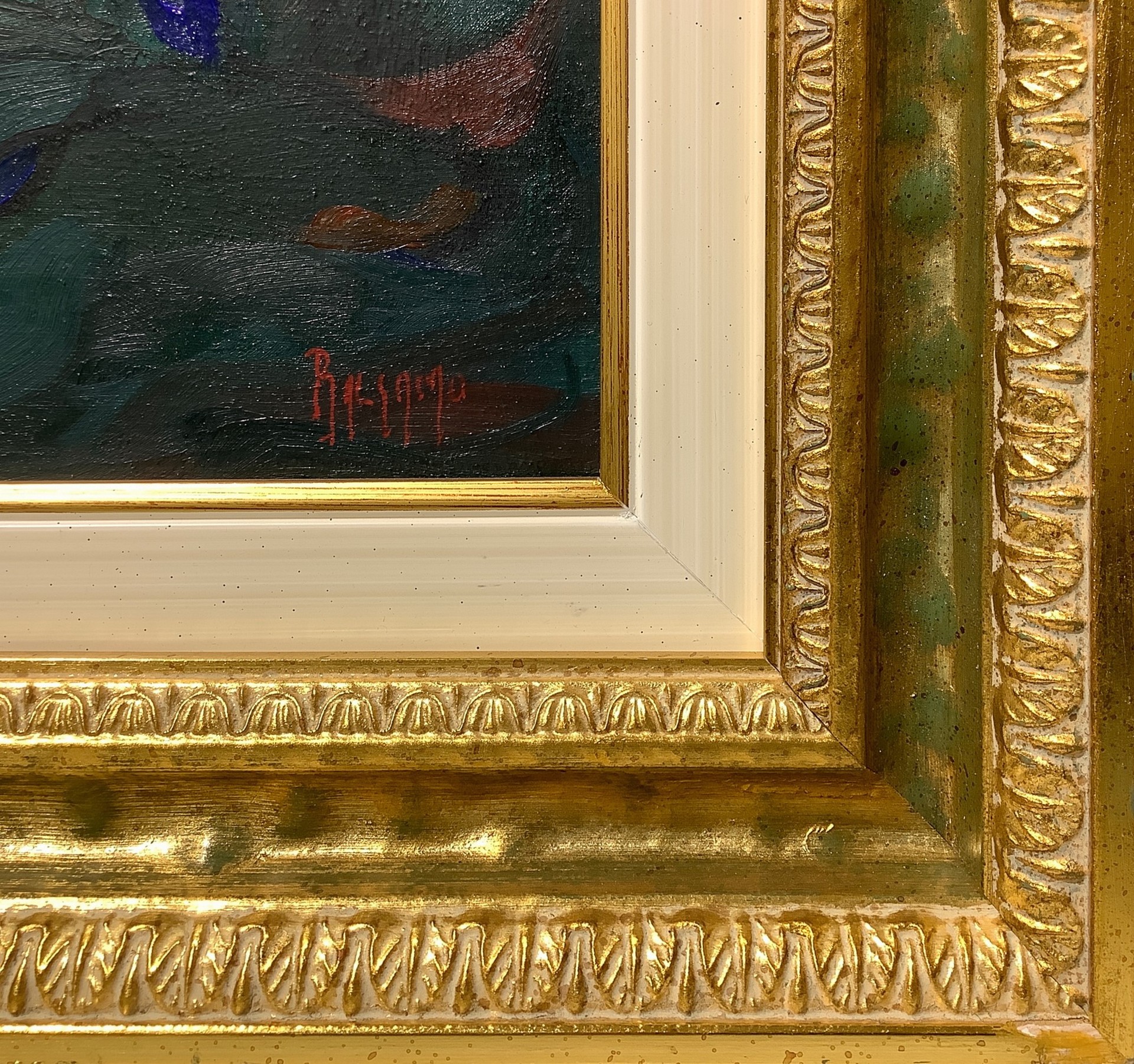 Firmato in basso a destra Balsamo. Vincenzo Balsamo è un pittore vivente originario di Brindisi dove nasce nel 1935. A causa della morte del padre deve lasciare gli studi e trova lavoro presso la bottega artigiana del pittore e decoratore Pietro Acquaviva. Inizialmente si occupa di restauro all’interno delle chiese, impiego che pian piano abbandona per dipingere. Nel dopoguerra si trasferisce a Roma dove s'iscrive alla Scuola d'Arte "San Giacomo". Tra le sue prime mostre pubbliche vi sono quella del "Circolo Cittadino" di Brindisi e a Roma presso la Galleria "Il Camino". Cura inoltre l'allestimento scenografico per il film "Cleopatra" negli studi di Cinecittà. A partire dagli anni Sessanta dipinge paesaggi toscani, umbri, laziali e campani dove i colori predominanti sono le tonalità del blu, dei rossi, dei verdi, dei gialli. Il suo stile conosce un processo evolutivo diventando espressivo e quasi astratto in quanto le campiture colorate si scompongono sempre più. Questo cambiamento è frutto di un meditato studio sui pittori cubisti e astratti.