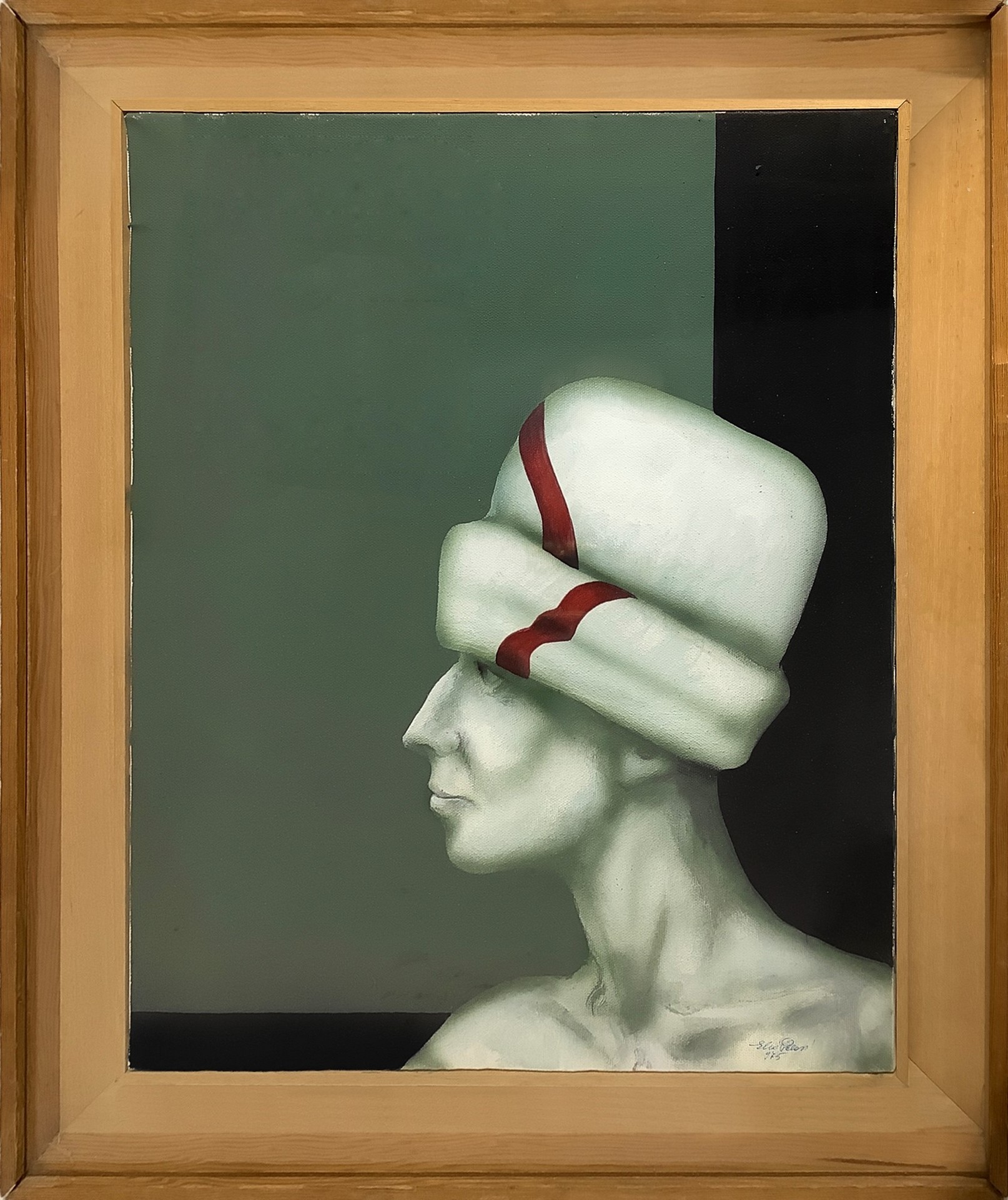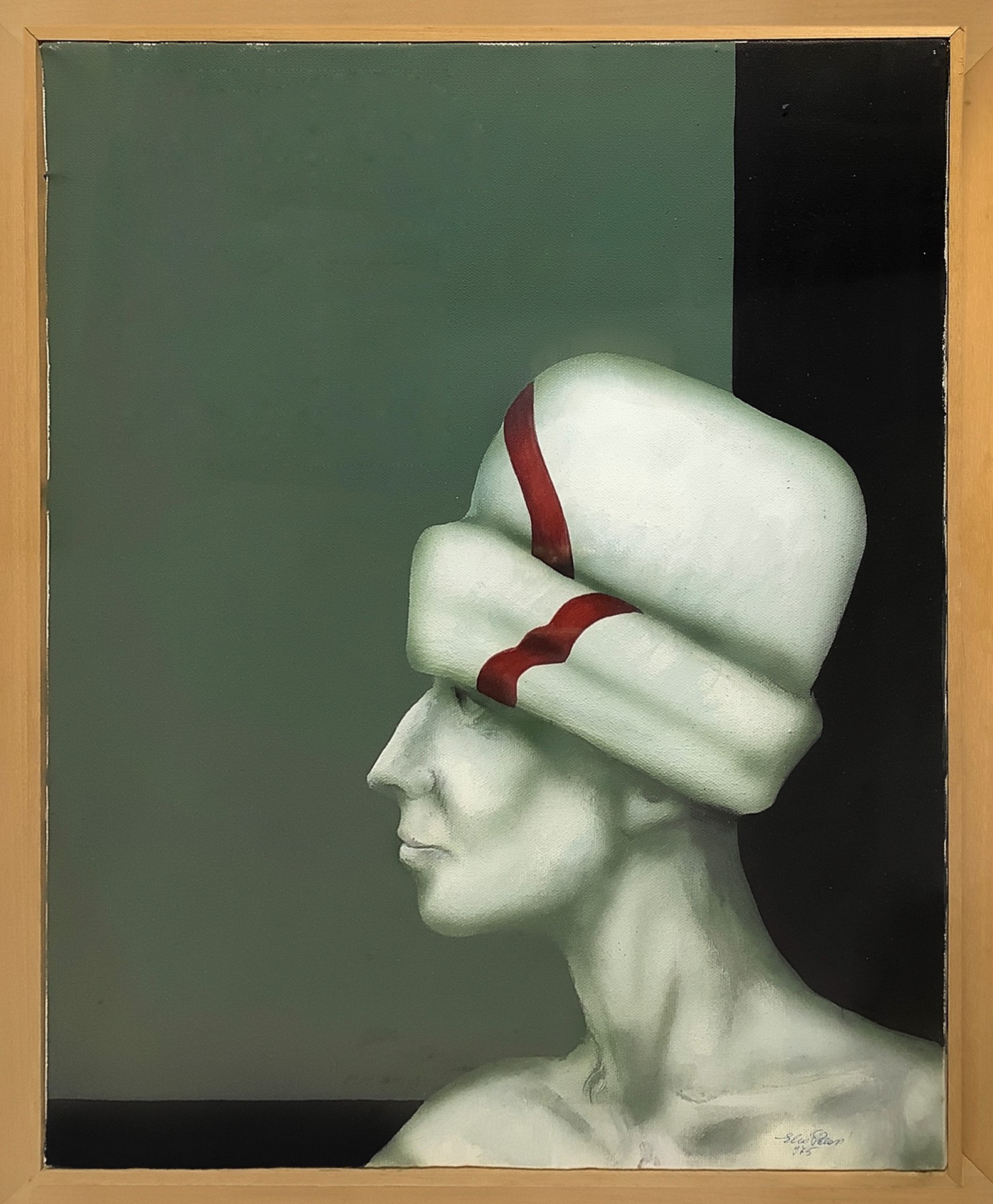 Pelosi, Elio - Senza titolo, 1975 cm 50X40, in cornice cm 62x52 Dipinto ad olio su tela Firmato e datato in basso a destra ed al retro. Al retro Timbro Studio Ganzerli (Napoli).
