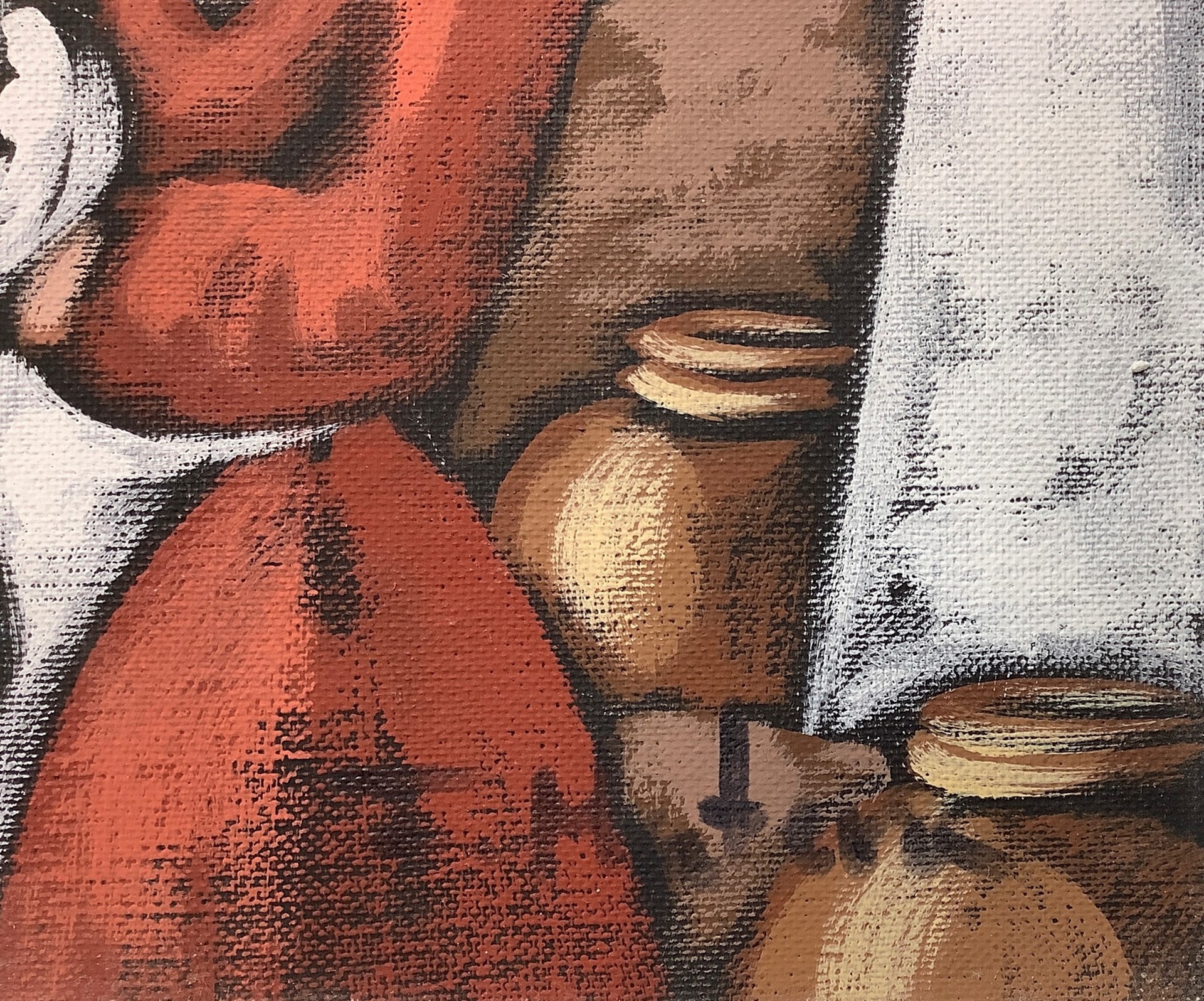 Matera, Francesco - Coppia di contadini con brocche, 20th century Cm 23x17, in cornice cm 49x44 Dipinto ad olio su cartone telato Firmato "F. Matera"