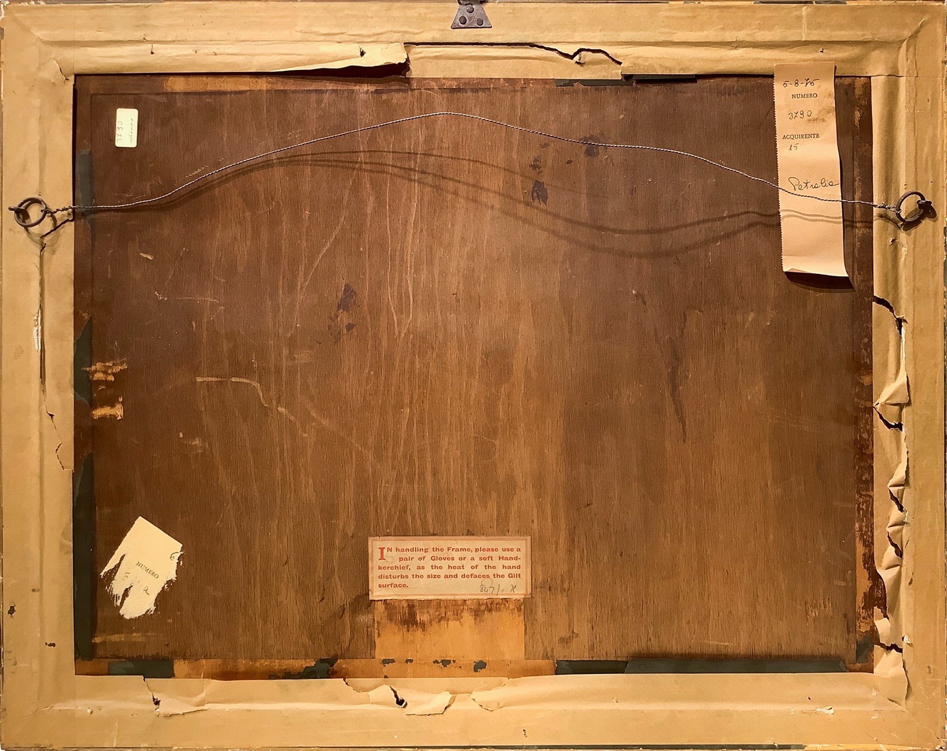 Personaggi sulla riva di un fiume con fonte, Early 20th century 30x40 cm, in cornice coeva 49x59 cm Dipinto a olio su tavola Pittore della metà del XX secolo. Firma illegibile.