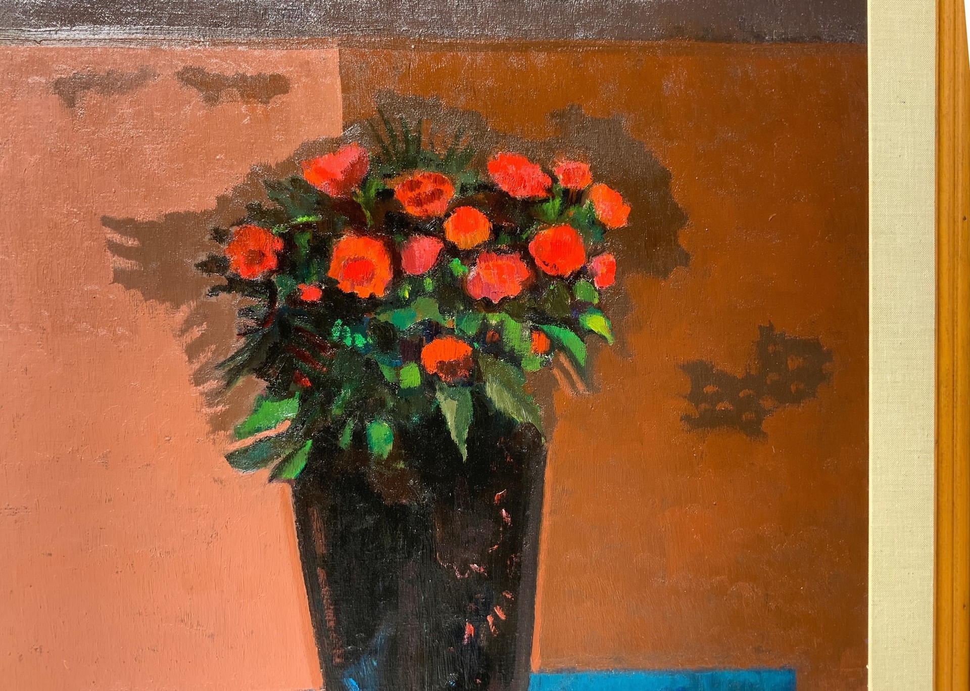 Guzzi, Peppe (Genova 1902-Roma 1982) - Natura morta e fiori con vaso, 1977 90x60 cm, in cornice 115x85 cm Dipinto ad olio su tela Firmato e datato 1977 in basso a sinistra e sul retro.