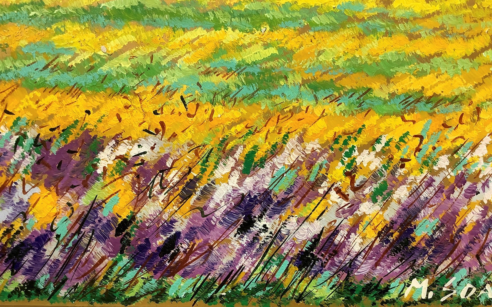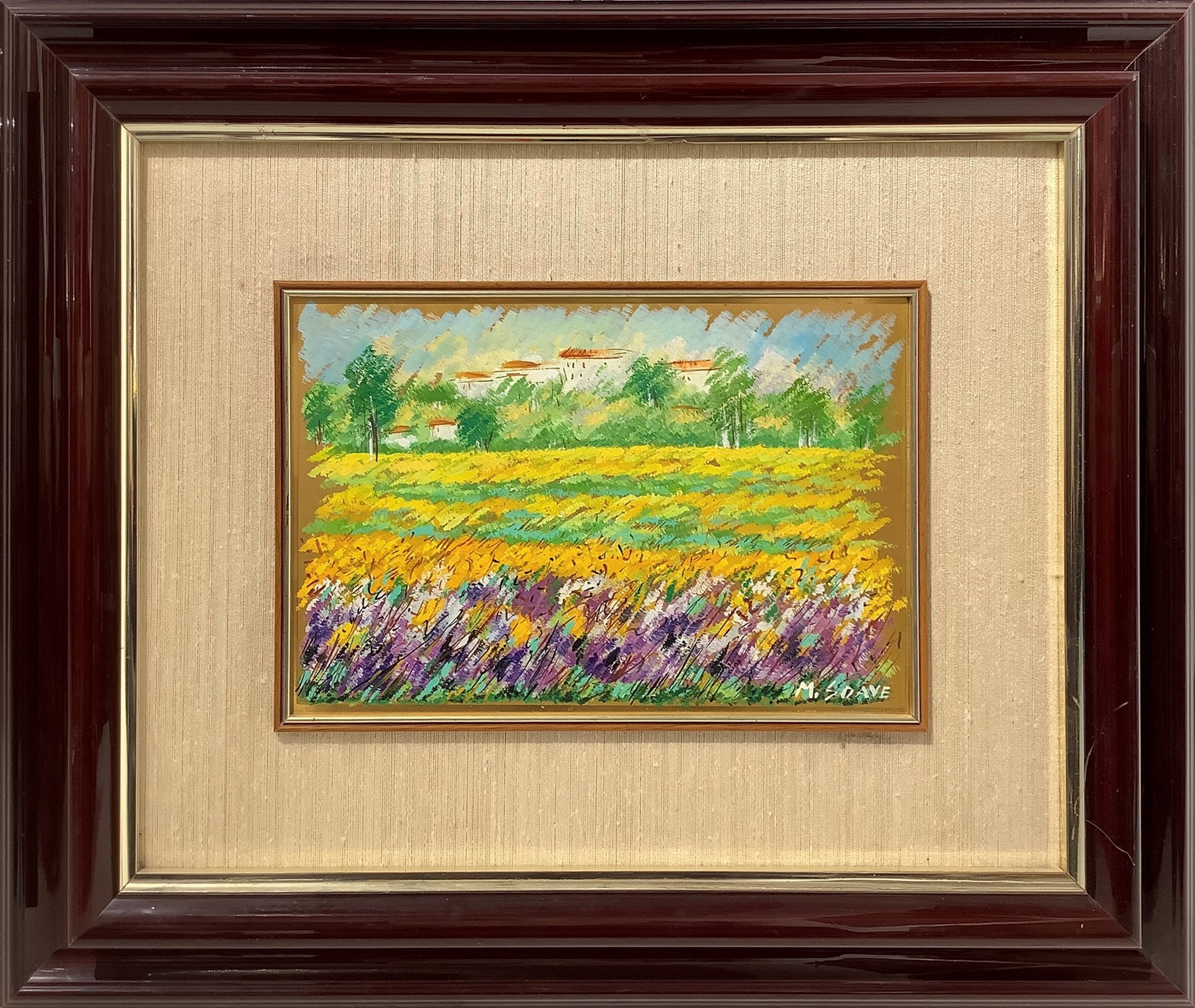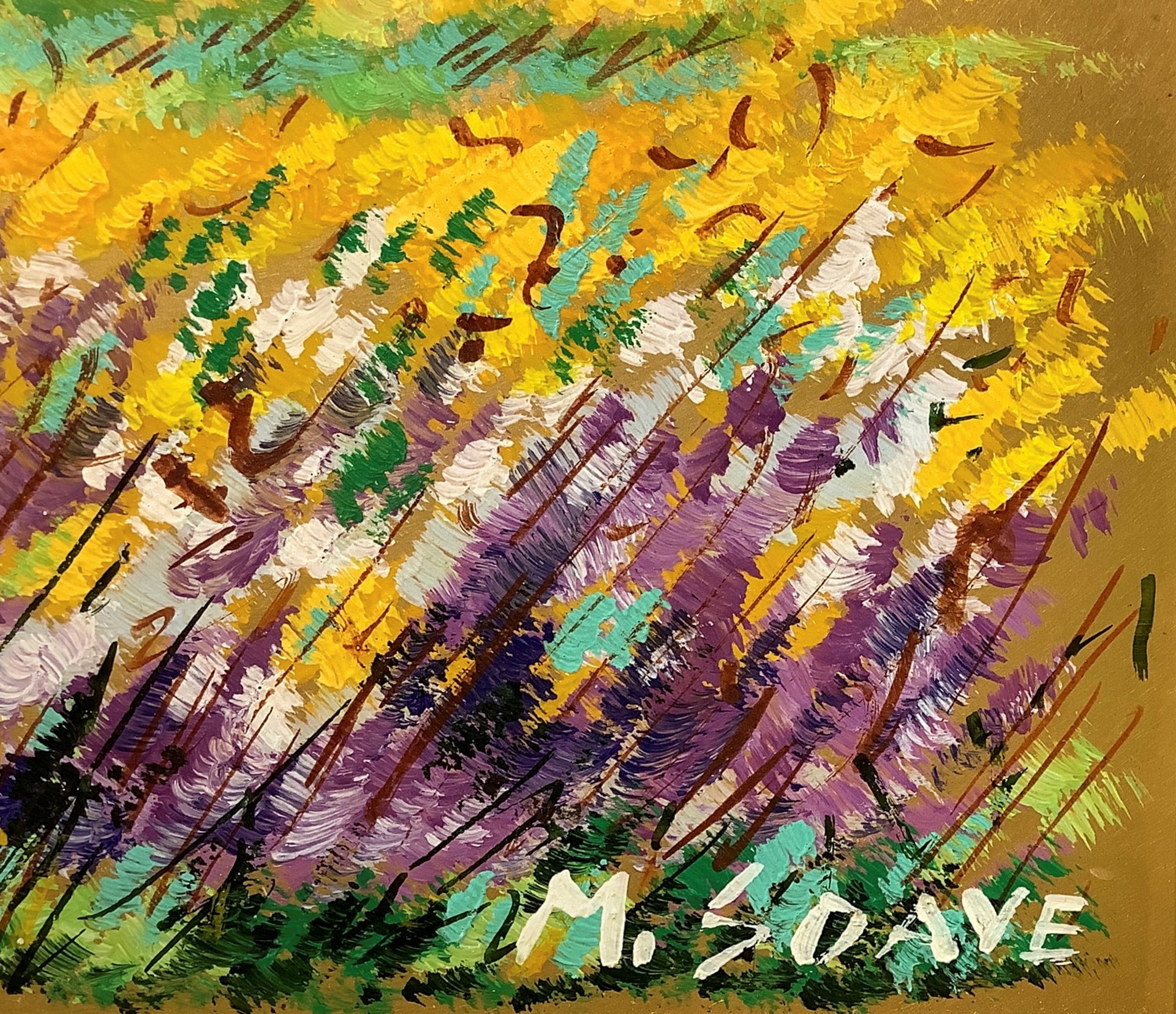 Soave, Mario (1955) - Campo di grano, 20th century H cm 20 x Base cm 30. In cornice: H cm 48,3 x Base cm 58 Dipinto a olio su lastra oro Firmato in basso a destra "M. Soave". Certificato di garanzia. Questo lotto è soggetto a diritto di seguito