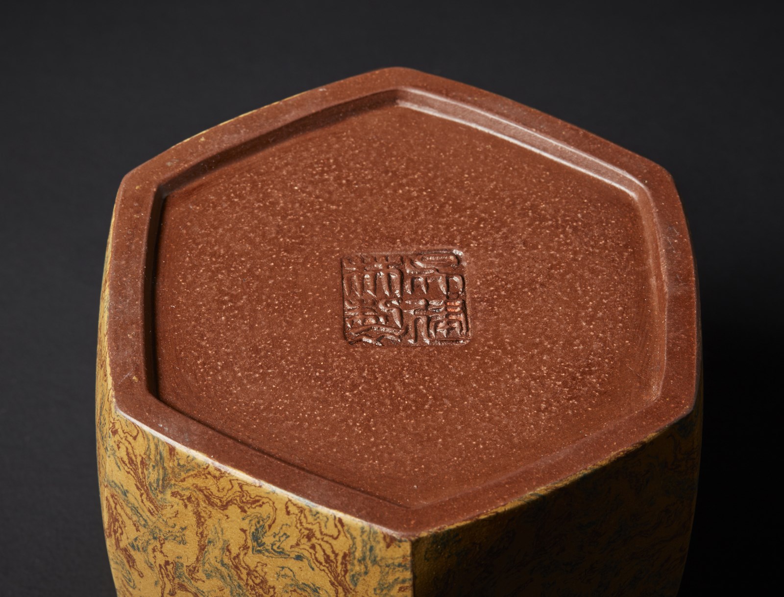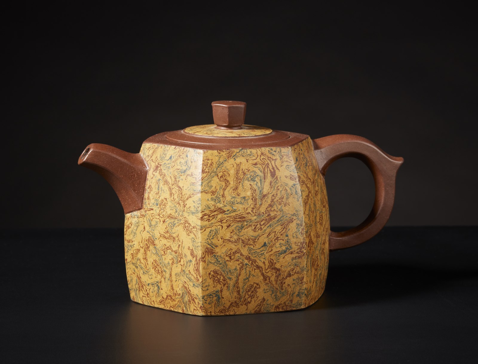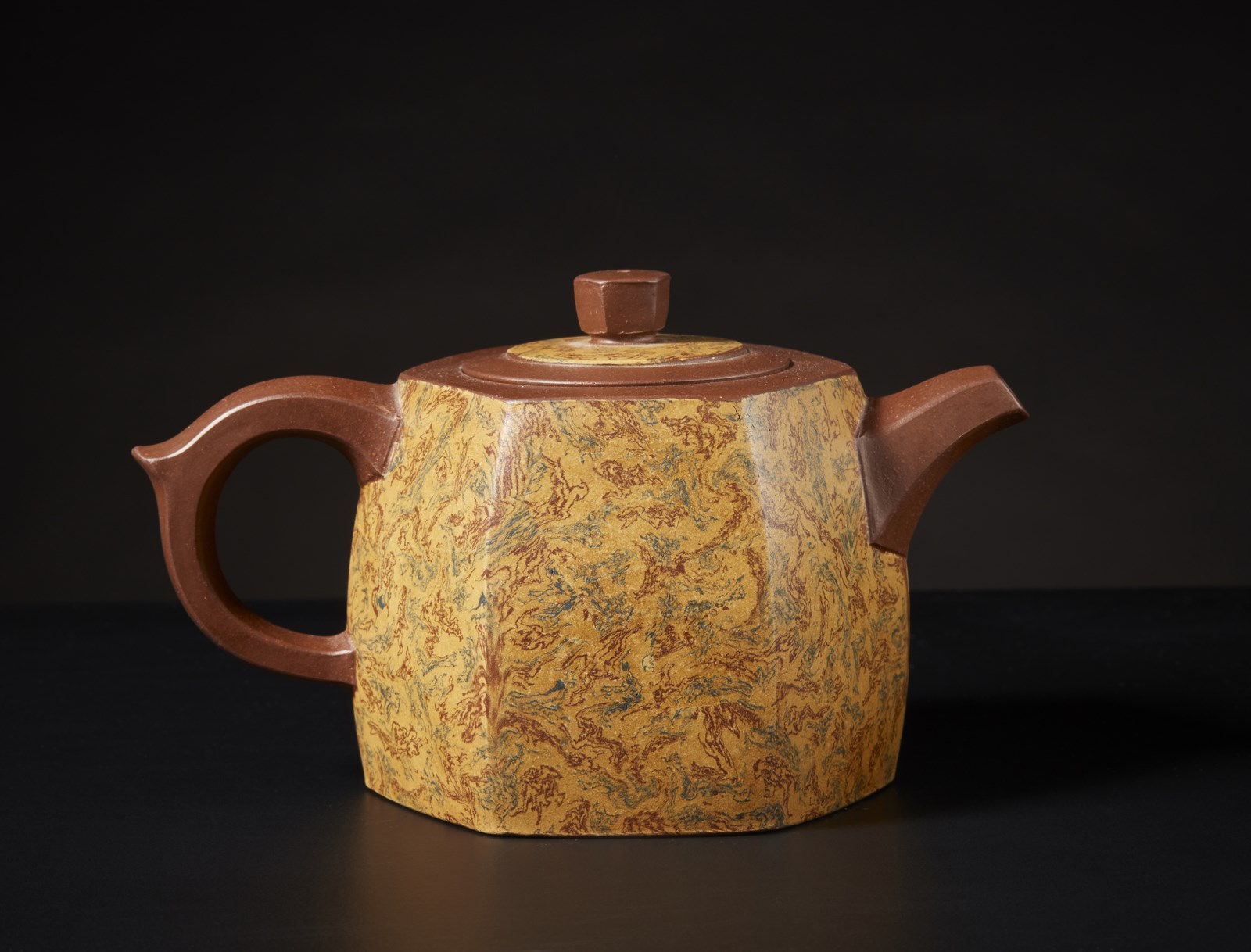 Cina, XX secolo. . Cm 15,00 x 10,00. Teiera a sezione esagonale in terracotta Yixing marmorizzata. Modello ceramico inconsueto per la presenza delle pareti realizzate con argille di diverso colore che creano un piacevole effetto marmorizzato. Marchio sul fondo.