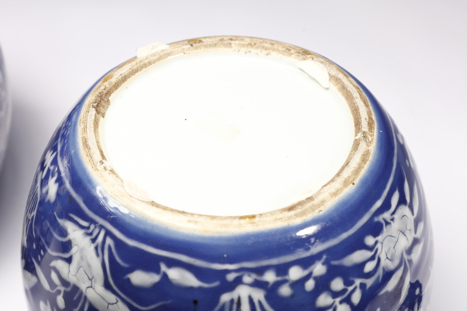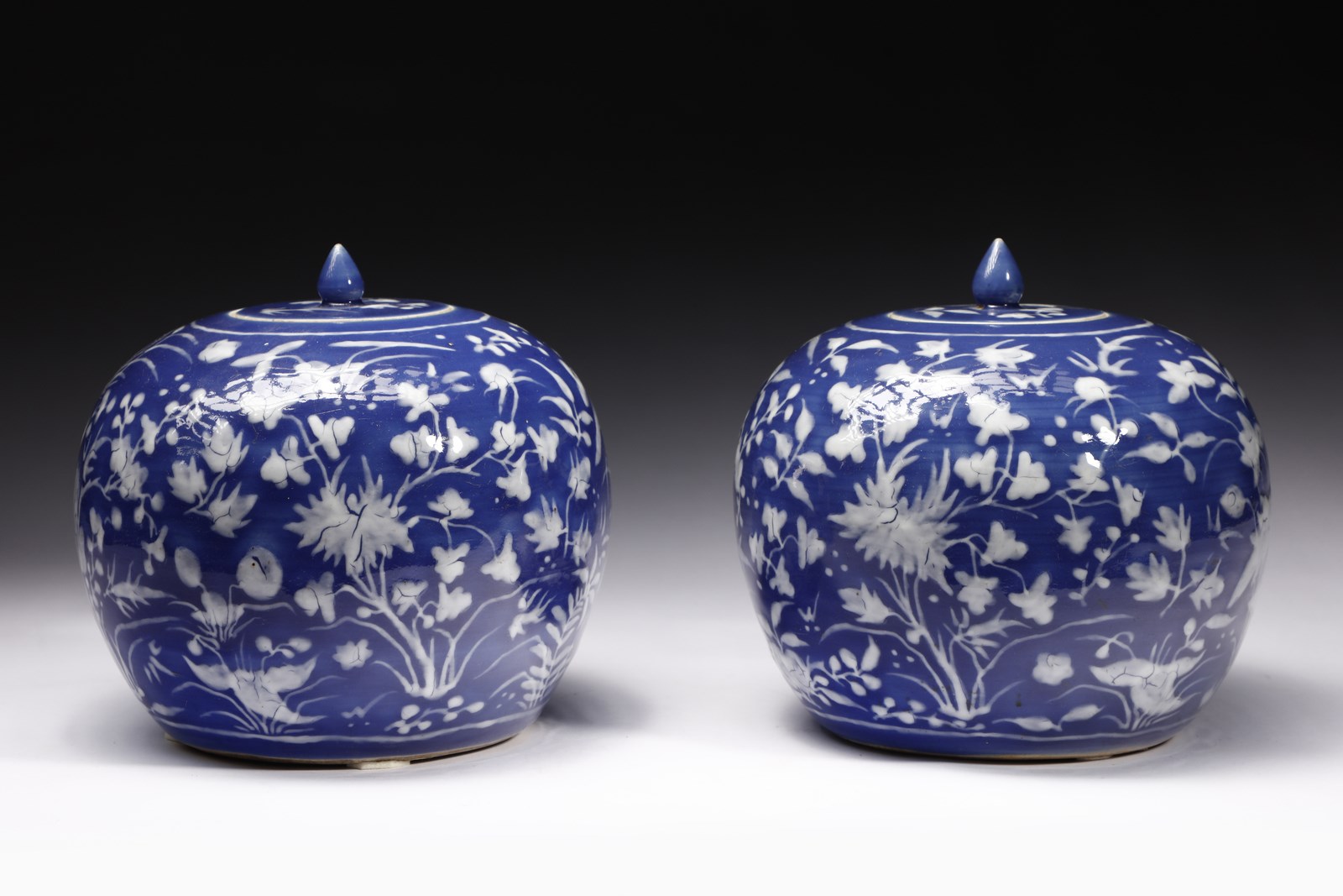 Cina, dinastia Qing, XIX secolo. . Cm 22,00 x 19,00. Elegante coppia di vasi ovoidali con coperchio decorati in bianco su fondo blu con piante palustri. Il motivo decorativo dello stagno con i suoi scenografici intrecci vegetali, caro alla tradizione cinese, è qui efficacemente declinato nel semplice contrasto bianco e blu della morbida coperta smaltata leggermente ondulata che riconduce alla piacevole freschezza delle acque.