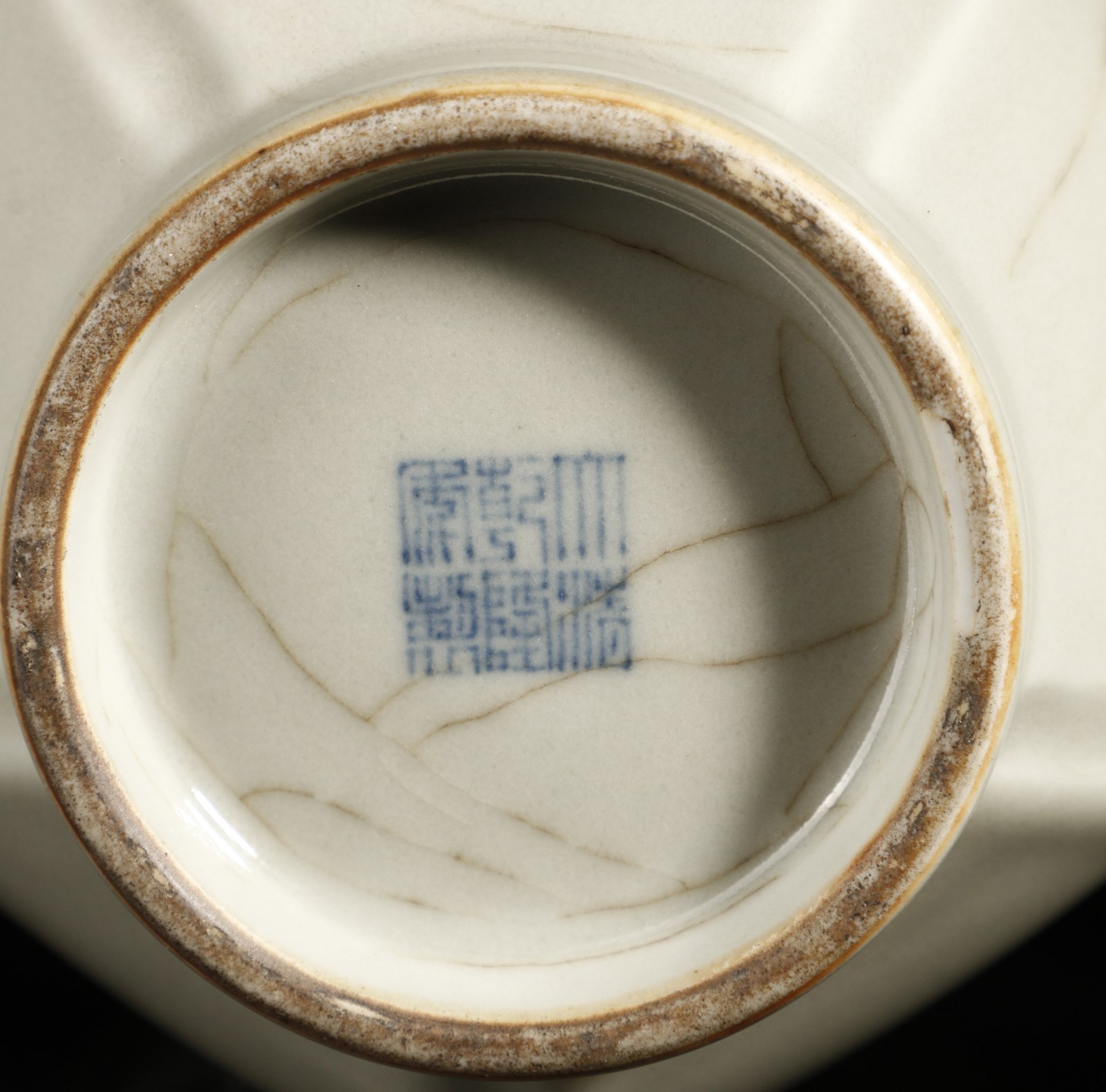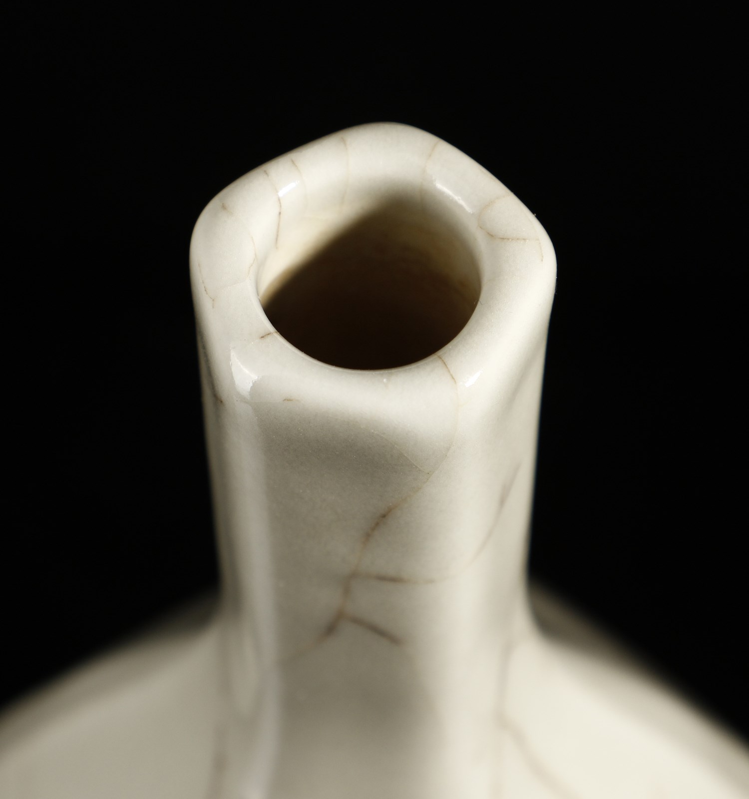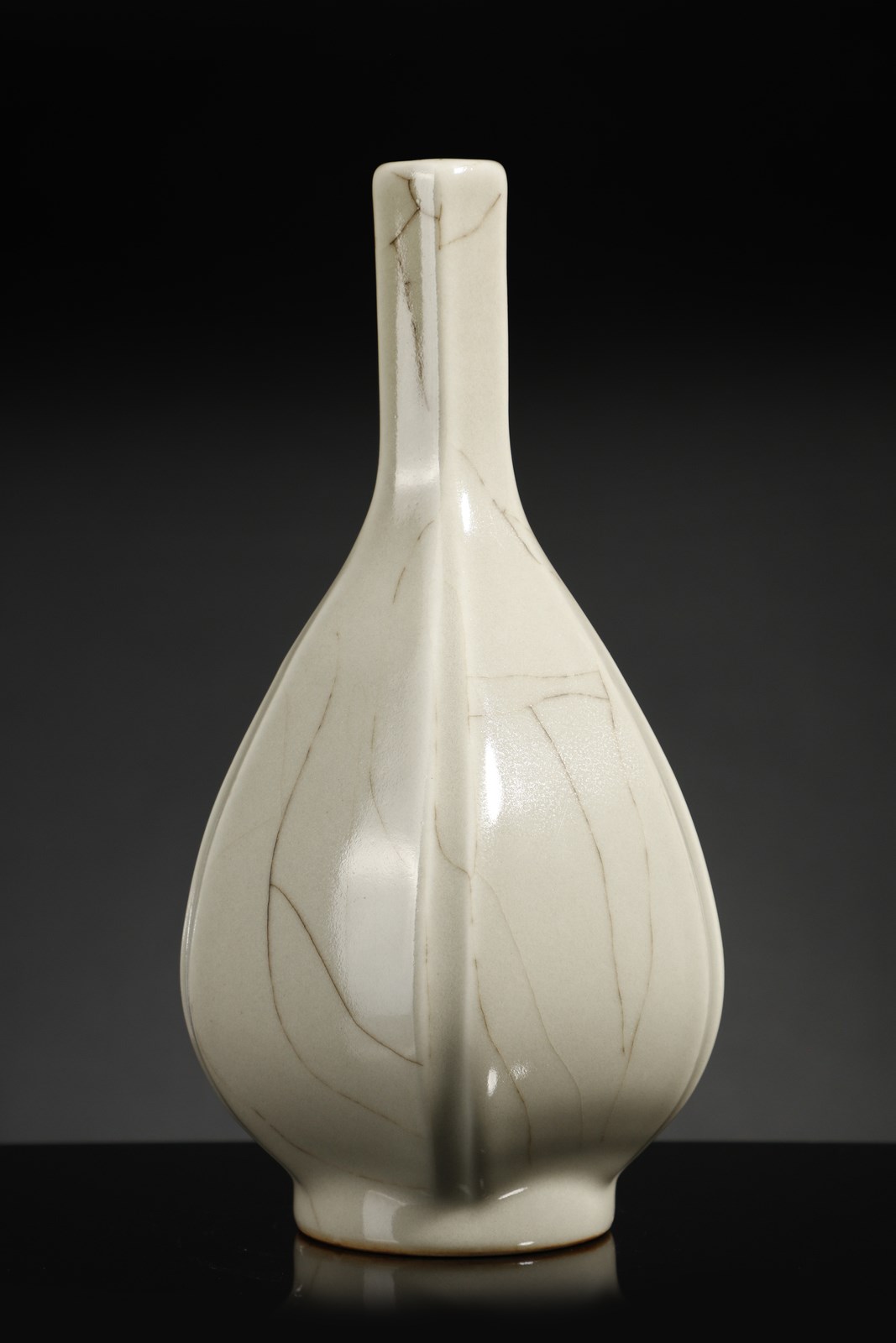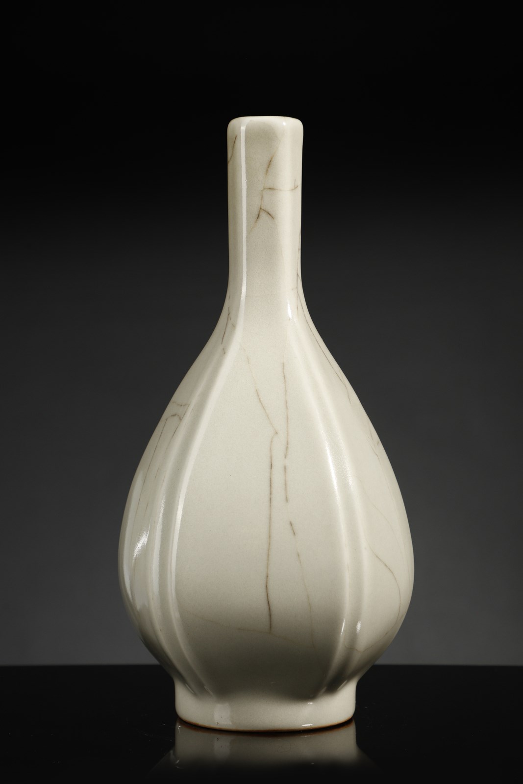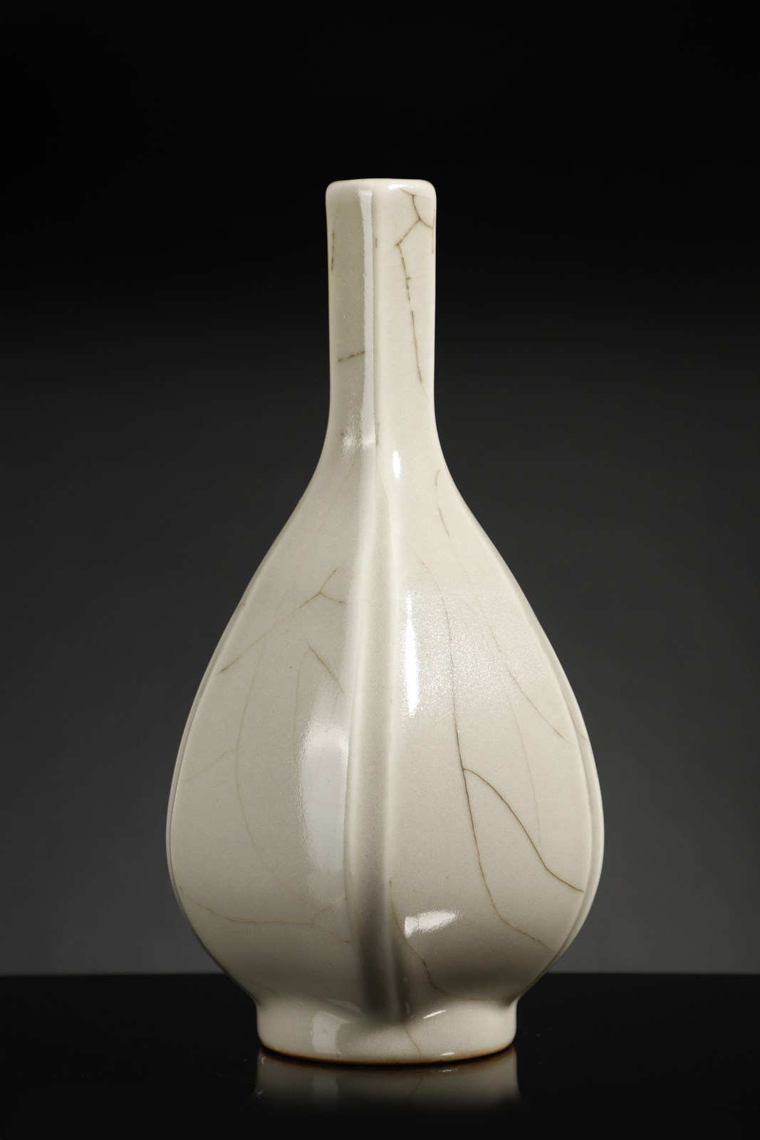 Cina, dinastia Qing, XIX secolo. . Cm 15,00 x 28,50. Vaso a bottiglia caratterizzato dal corpo piriforme a sezione esagonale e dall'alto collo diritto. Il corpo ceramico, ispirato ai modelli in bronzo di epoca Han, risulta interamente coperto da una fitta craquelure nera su fondo bianco ad imitazione dei prestigiosi manufatti “Ge” di epoca Song (960-1279). Sul fondo è presente marchio sigillare a sei caratteri di Qianlong (1735-1796) in blu sottocoperta.