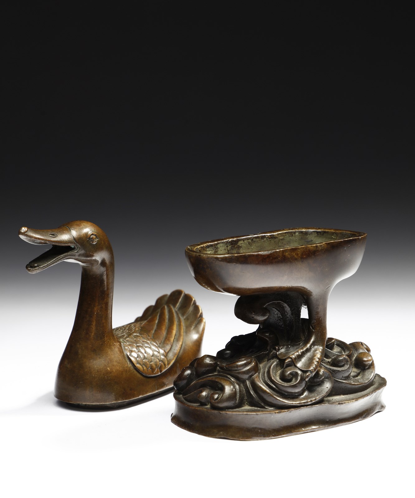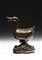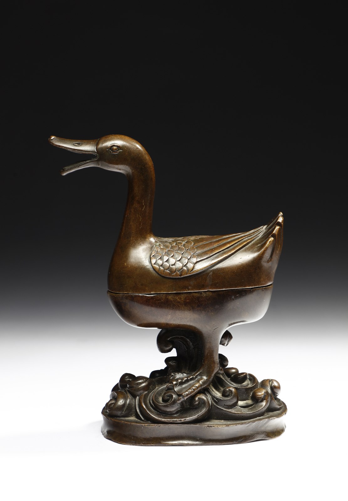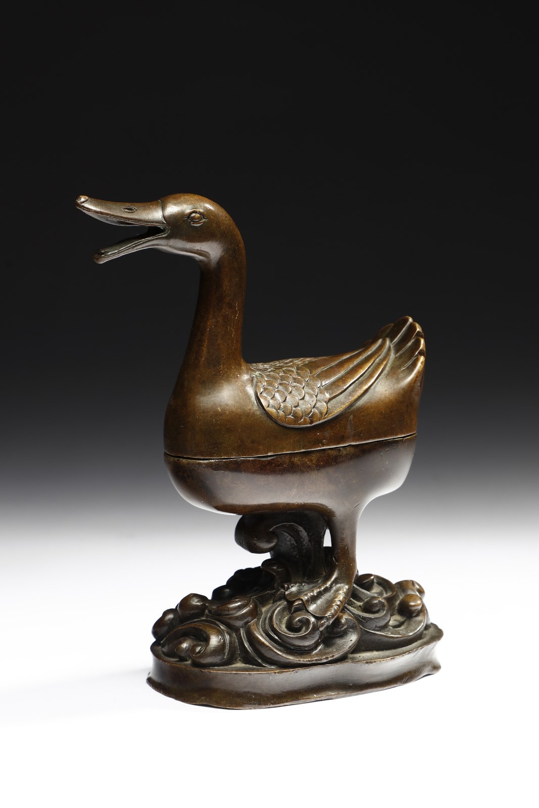 Cina, dinastia Ming (1368-1644). . Cm 13,00 x 16,00. Contenitore brucia-profumi in bronzo a patina bruno-rossastra raffigurante un'anatra sulle acque. Questo tipo di oggetti, spesso legati a modelli ricorrenti ispirati al mondo animale, come il cervo, il leone o appunto l'anatra mandarina, ebbero una notevole diffusione durante gli ultimi anni della dinastia Ming e gli inizi di quella Qing. Il pezzo qui presentato si contraddistingue per la bella fusione impreziosita da una piacevole patina rossastra abbastanza inconsueta in questo genere di manufatti.