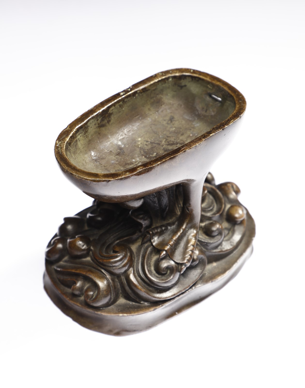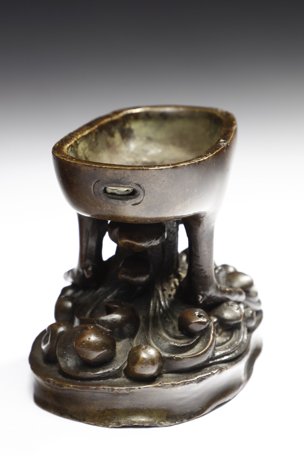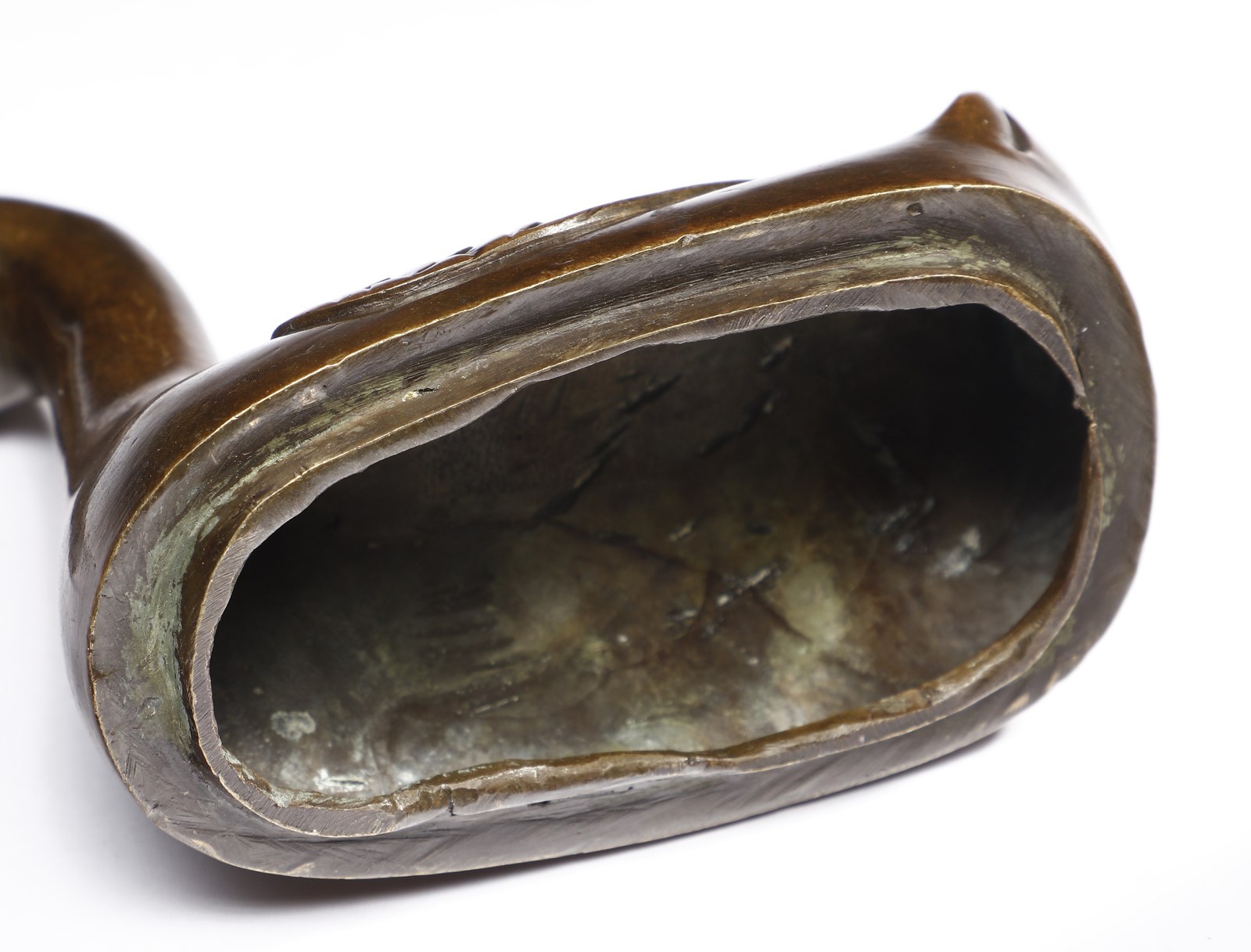 Cina, dinastia Ming (1368-1644). . Cm 13,00 x 16,00. Contenitore brucia-profumi in bronzo a patina bruno-rossastra raffigurante un'anatra sulle acque. Questo tipo di oggetti, spesso legati a modelli ricorrenti ispirati al mondo animale, come il cervo, il leone o appunto l'anatra mandarina, ebbero una notevole diffusione durante gli ultimi anni della dinastia Ming e gli inizi di quella Qing. Il pezzo qui presentato si contraddistingue per la bella fusione impreziosita da una piacevole patina rossastra abbastanza inconsueta in questo genere di manufatti.