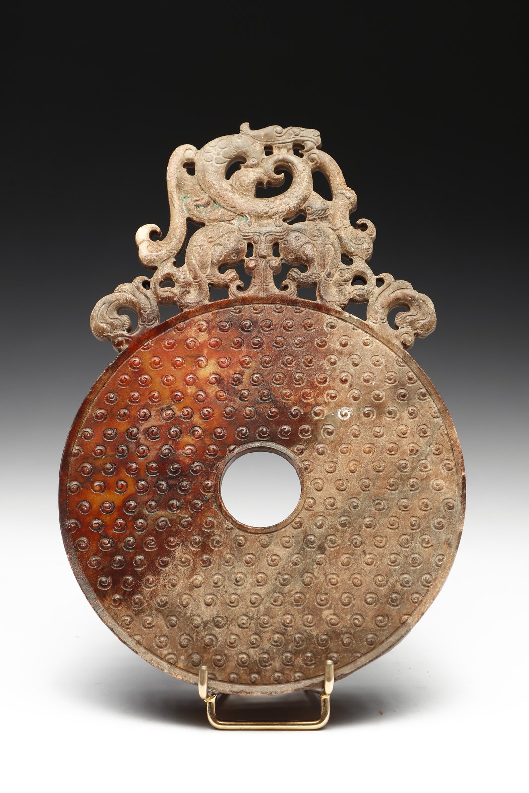Cina, dinastia Qing, secolo XIX (?). . Cm 14,00 x 21,00. grande intaglio in giada calcificata lavorato a rilievo secondo il gusto “archeologico” con motivo “a chicco di miglio” ed elaborata cuspide sommitale operata a traforo con figure di draghi, qilong e taotiè. Questo oggetto, conosciuto come “Pi”, costituisce uno dei oggetti rituali più iconici della millennaria cultura cinese. I più antichi riscontri storici legati a questa particolare tipologia di manufatti risalgono al neolitico e sono riconducibili alla cultura di Liangzhu, l'ultima delle grandi culture del neolitico cinese, fiorita sul delta dello Yangtze intorno al quarto millennio avanti Cristo. Secondo gli studiosi la particolare forma a disco forato al centro sarebbe da ricondurre ad una iperstilizzazione dell'universo, legata a simbologie metafisiche che vedono nel foro centrale un’immagine dell'asse celeste su cui è incardinato l'intero firmamento. Questa interpretazione, oggi universalmente condivisa, sembra che nel XVIII secolo non dovesse essere stata ancora formulata, considerato che lo stesso imperatore Qianlong, erudito possessore di una formidabile raccolta di oggetti archeologici, facesse iscrivere sul più bello dei suoi dischi in giada un poemetto di sua creazione in cui descriveva l'elegante manufatto come “un porta tazza di epoca Song”.