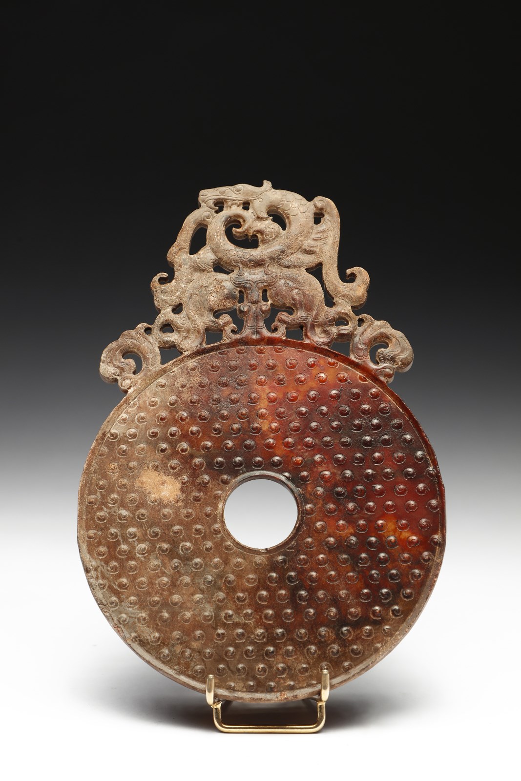 Il disco qui presentato, caratterizzato dal prezioso ed elaborato decoro riprende modelli conosciuti riconducibili al periodo cosiddetto “degli Stati Combattenti”(475 a.C- 403 a.C), periodo di guerre caratterizzato, al contempo, da una suprema eleganza formale che diventerà la cifra distintiva della successiva cultura Han (202 a.C-220 d.C).