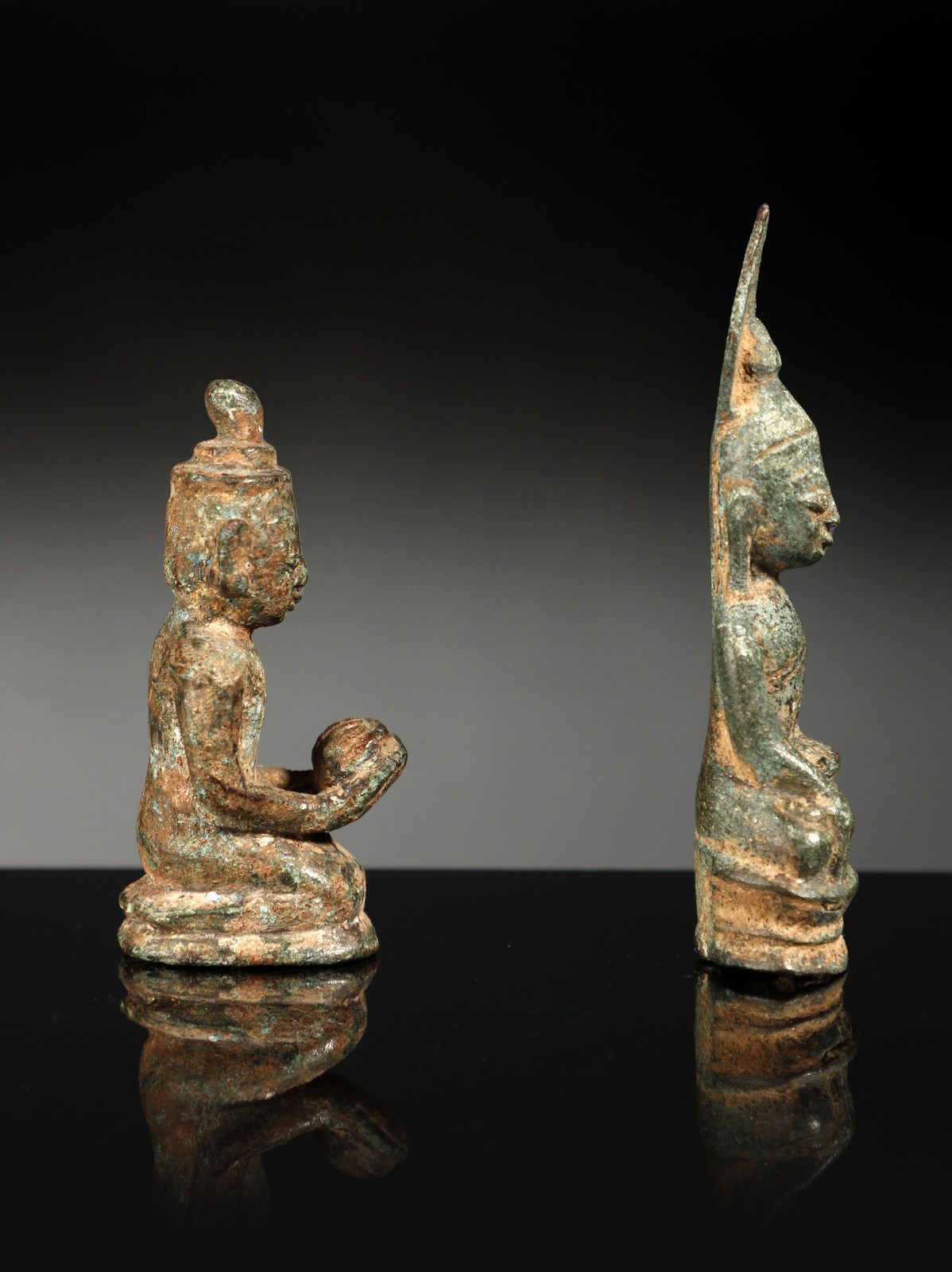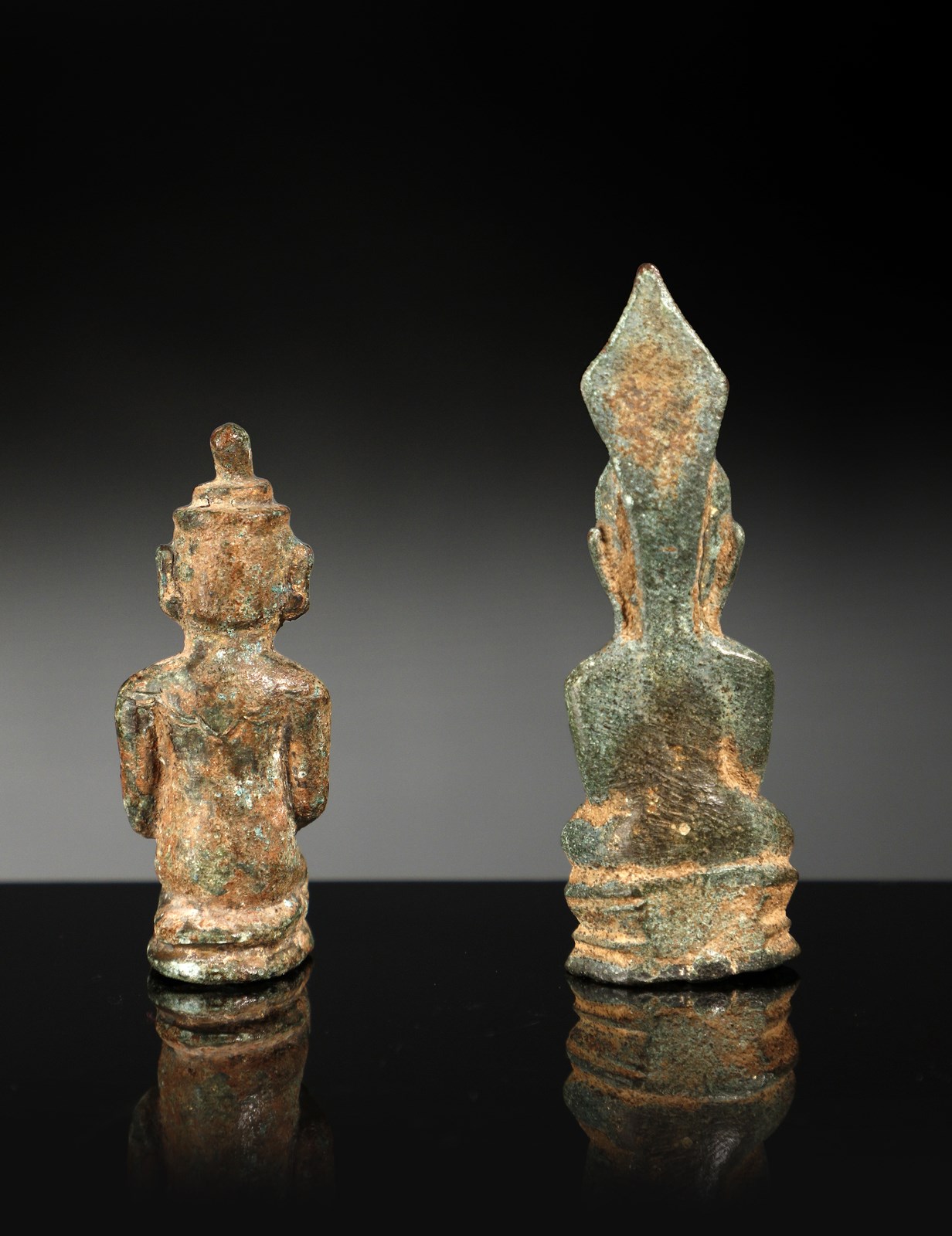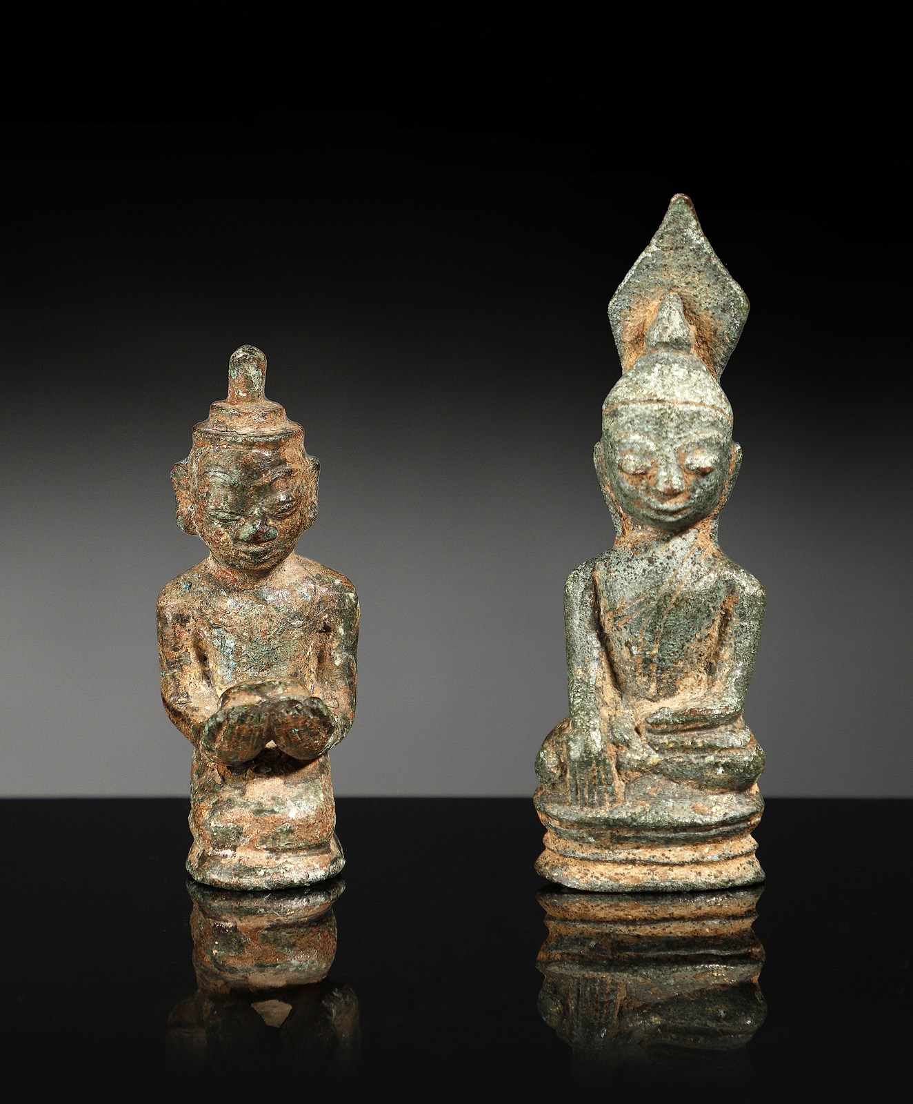 Tailandia, periodo Ayutthaya, XIV secolo. . Cm 7,50. Due piccole fusioni in bronzo a patina di scavo color verde brillante con incrostazioni brune raffiguranti un offerente inginocchiato ed il Buddha in Buhumisparsha Mudra. Le piccole dimensioni fanno presupporre che si tratti di due oggetti destinati ad uso votivo per altari privati di piccole dimensioni.