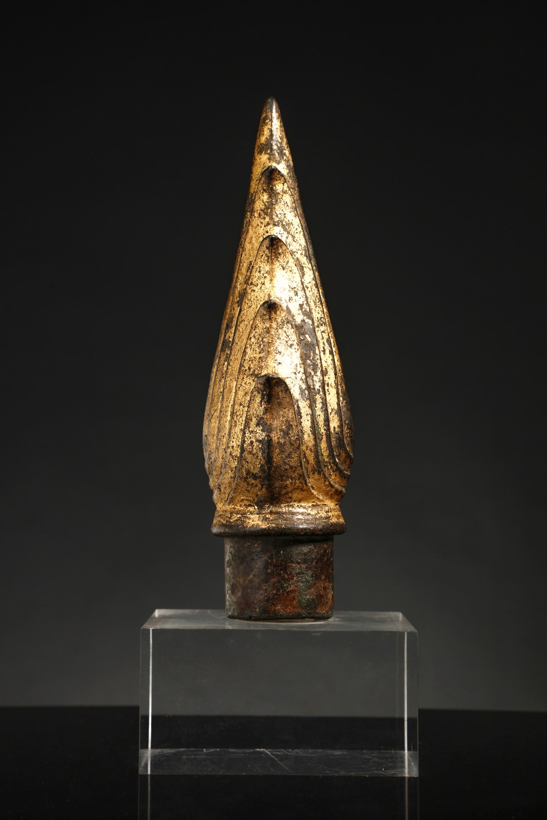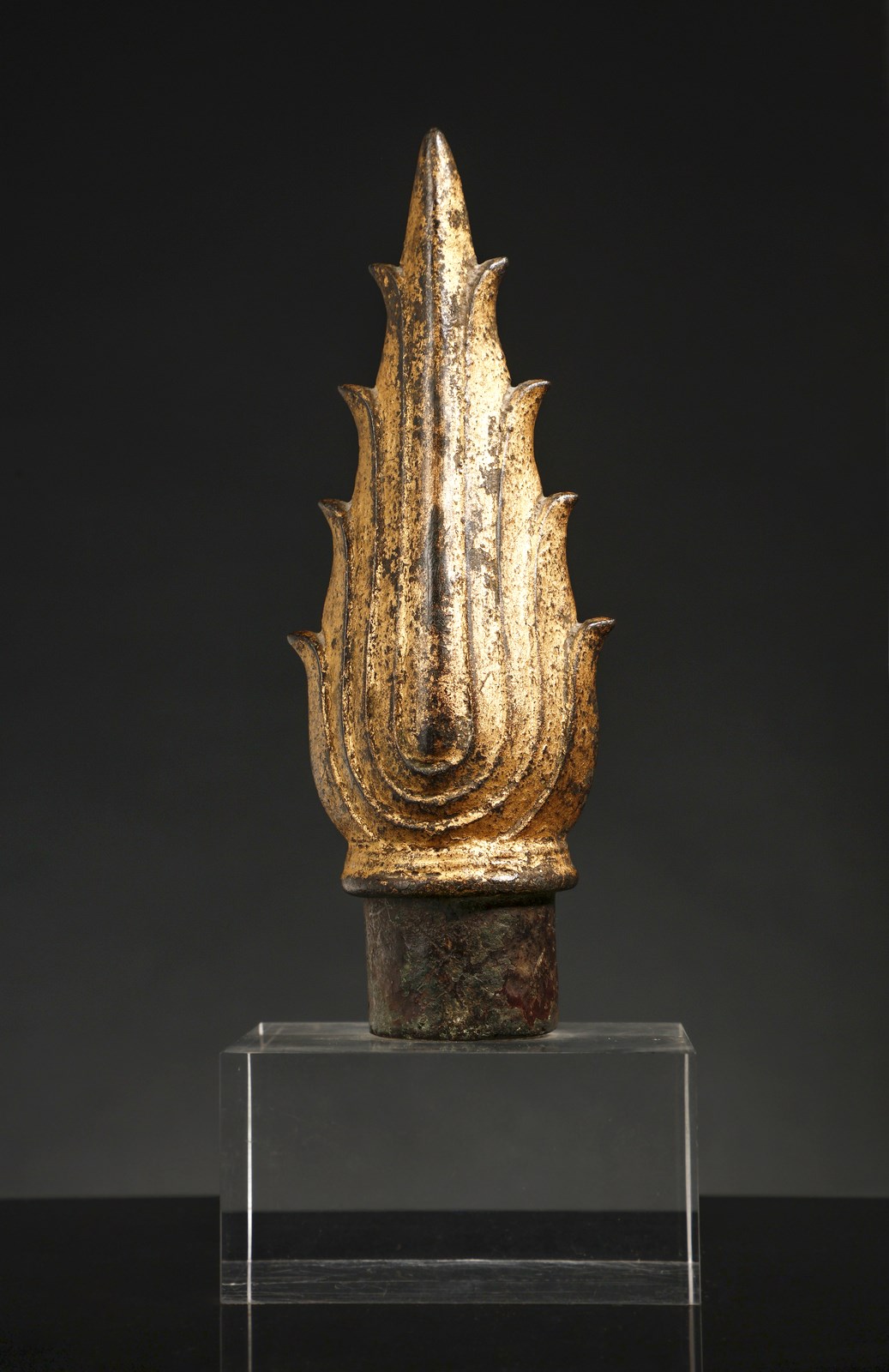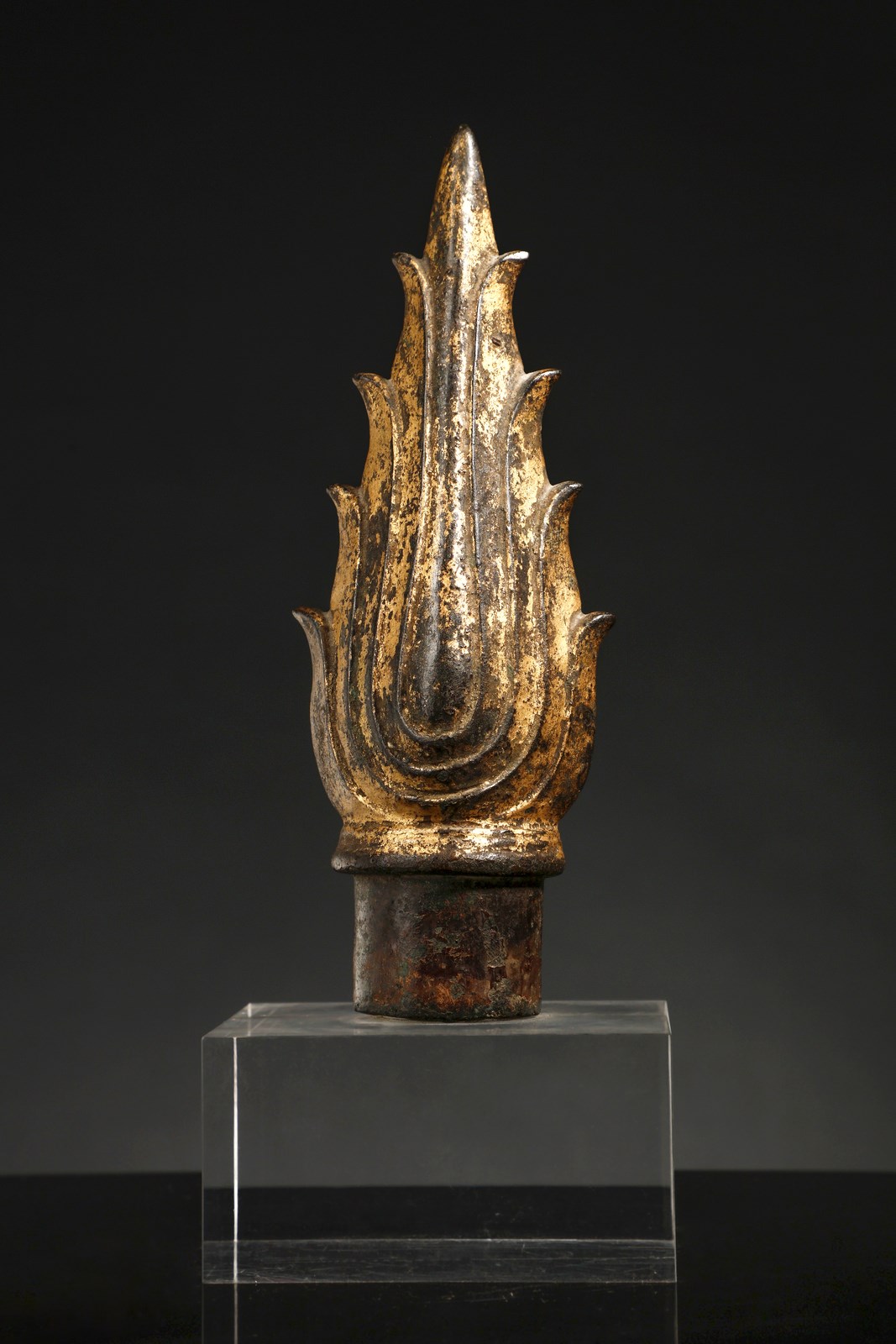Tailandia, Ayutthaya (1351-1767), XV secolo . . Cm 20,00. Fiamma in bronzo dorato di grandi dimensioni facente parte di una scultura colossale di Buddha dove era posta alla sommità dell' Ushnisha secondo la tradizionale iconografia buddista. L'Ushnisha, tipica protuberanza cranica posta alla sommità del capo del Buddha storico, coperta dalla particolare acconciatura dei capelli, costituisce il trentaduesimo dei maggiori attributi del Buddha. Nella specifica iconografia tailandese, sviluppata già intorno al XII secolo, l'Ushnisha viene sempre rappresentata sormontata da un fiamma allungata a simboleggiare il potere spirituale del Buddha e la sua “illuminazione”.