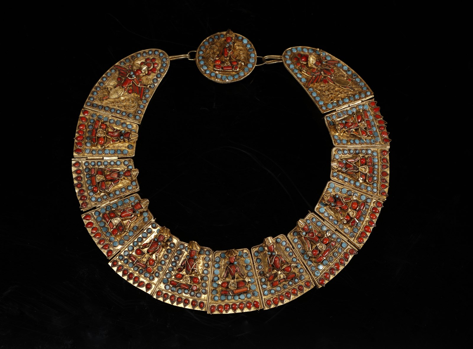 Arte Himalayana Collare devozionale in metallo dorato e coralli