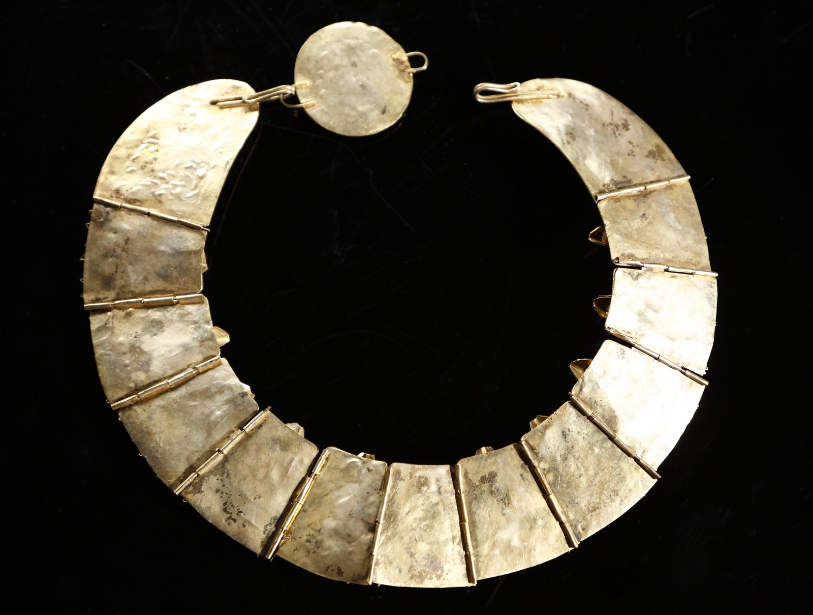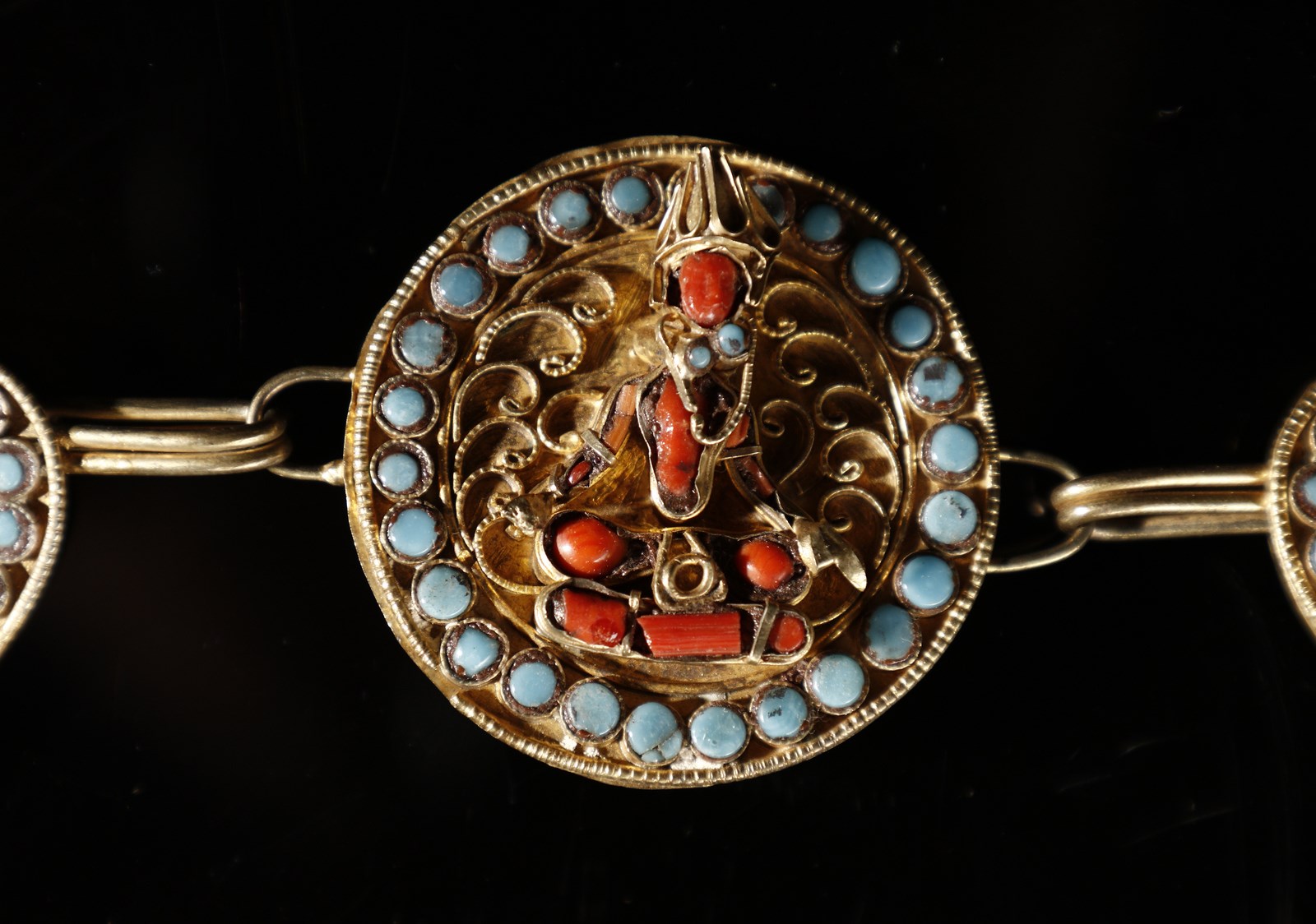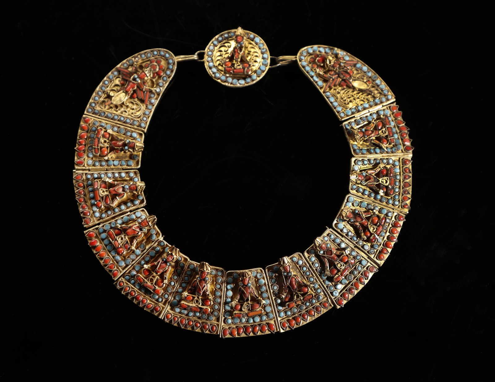 Nepal, valle di Kathmandu, etnia Newari, inizio XX secolo . . Cm 27,00. Bel collare formato da tredici placche trapezoidali e chiusura circolare lavorate in filigrana ed incastonate con coralli, turchesi e pietre semi-preziose a formare la figura di Avalikotesvara ripetuto, mentre nelle due placche terminali è raffigurato Garuda, divinità alata hindu. Si tratta quindi di un manufatto sincretico che unisce buddismo ed induismo.