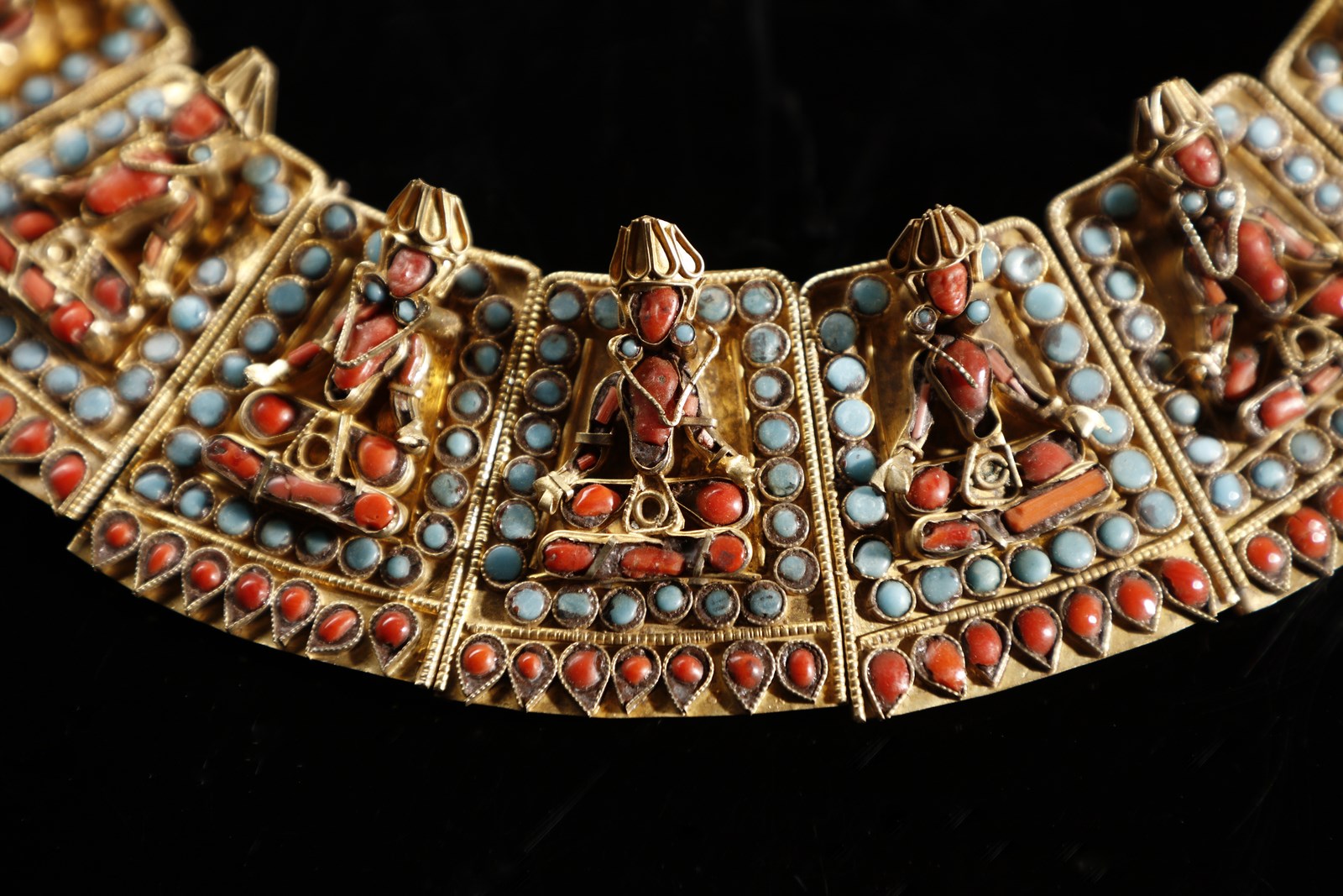 Arte Himalayana - Collare devozionale in metallo dorato e coralli Nepal, valle di Kathmandu, etnia Newari, inizio XX secolo .