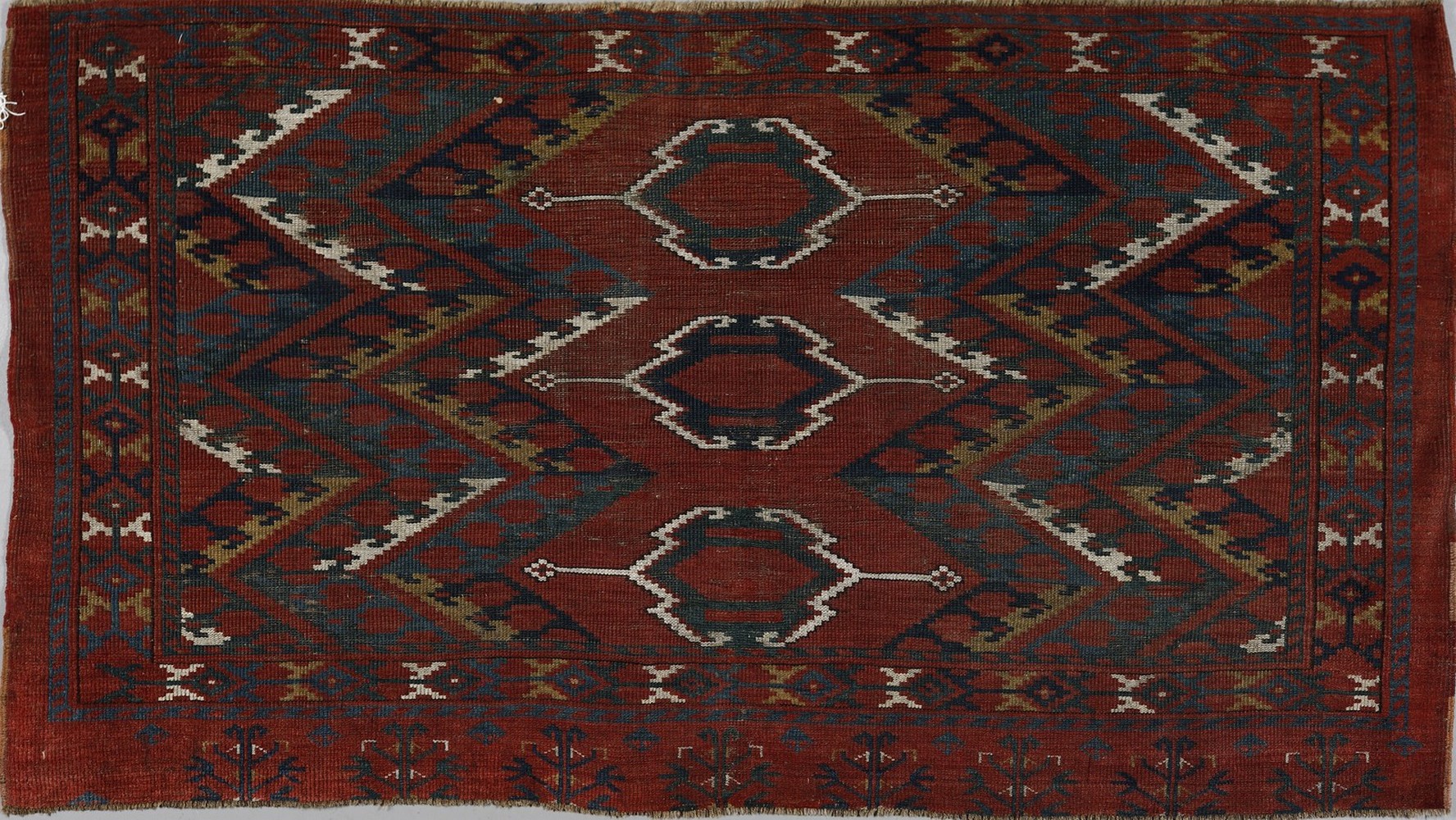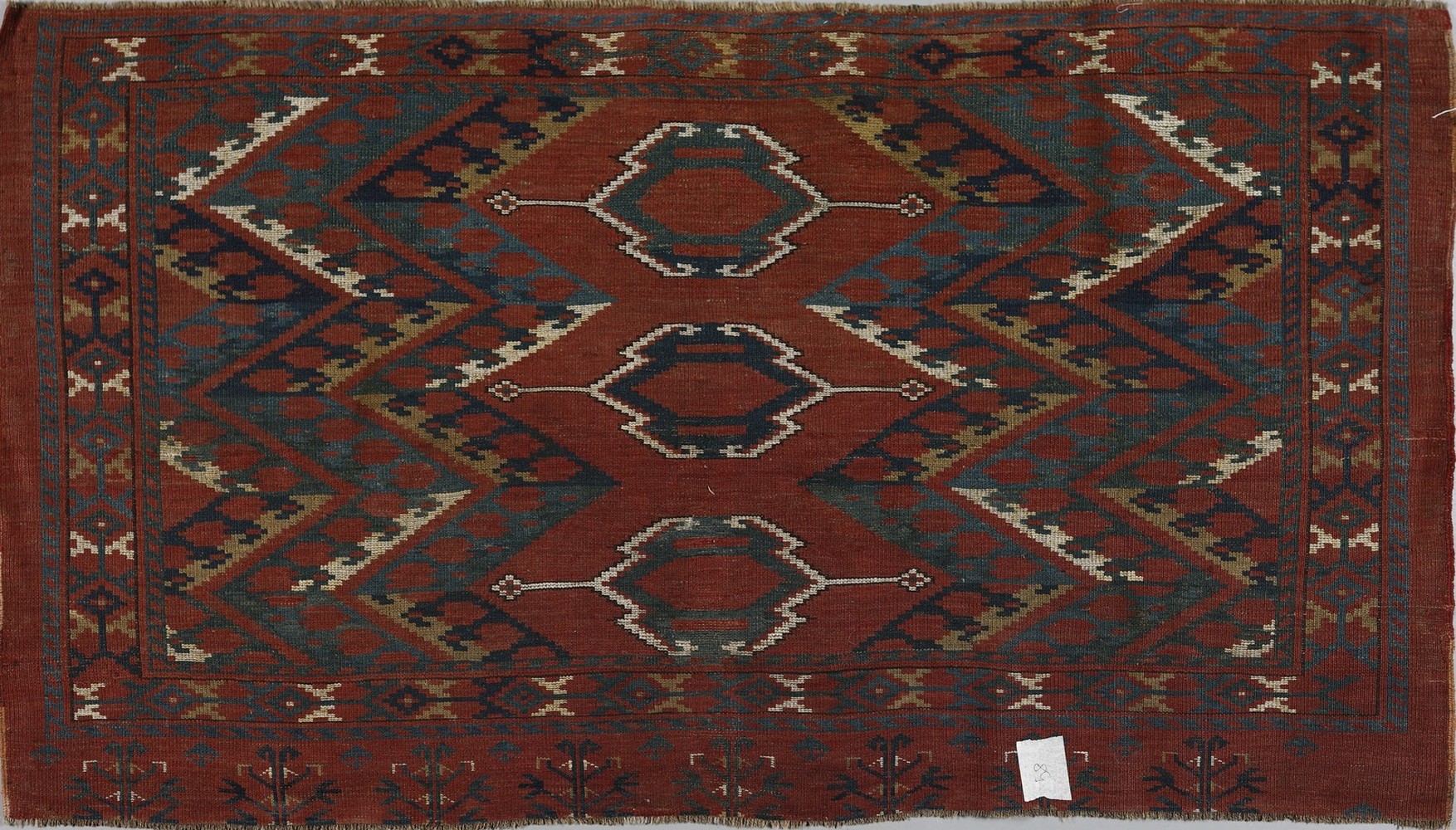 Uzbekistan / Afghanistan, tardo XIX secolo. . Cm 83,00 x 147,00. Tappeto turcomanno a fondo rosso con decorazioni geometriche policrome.
