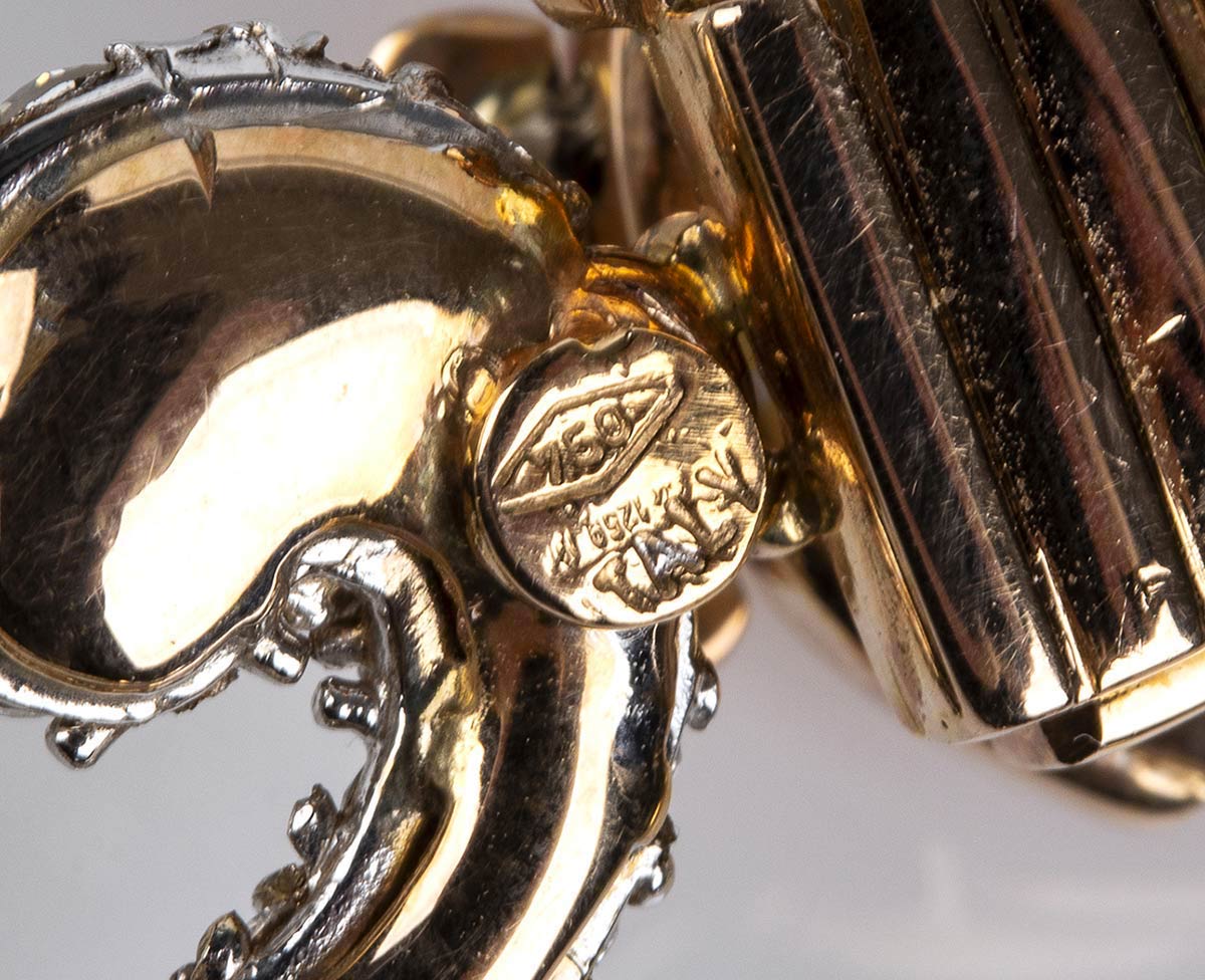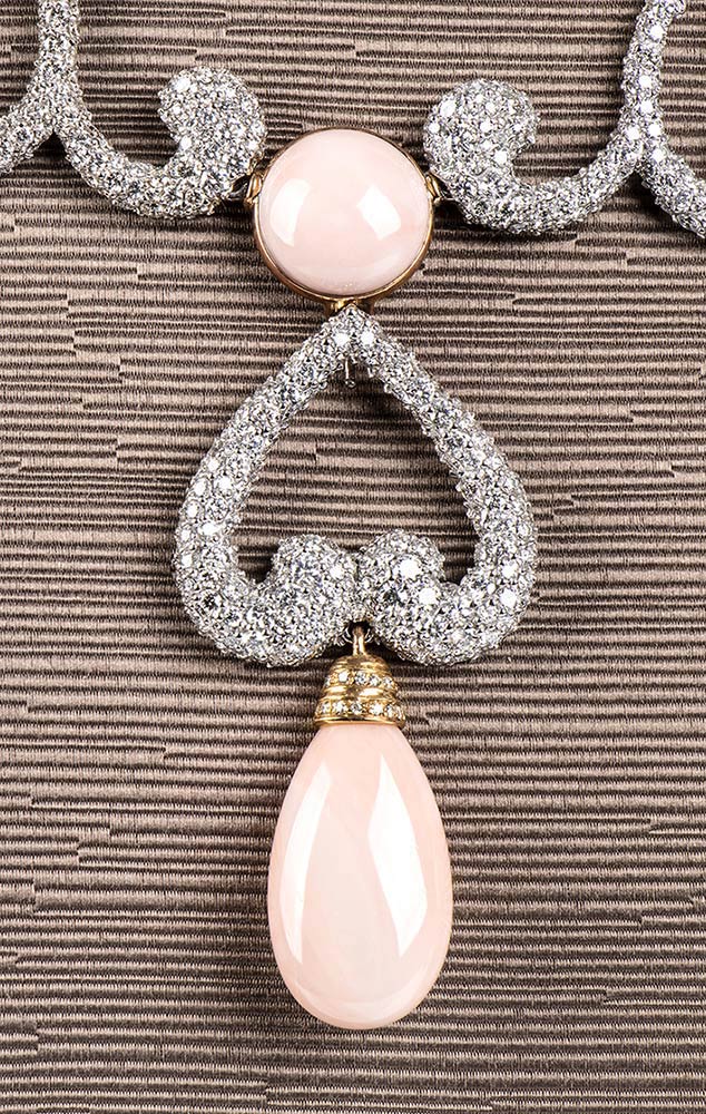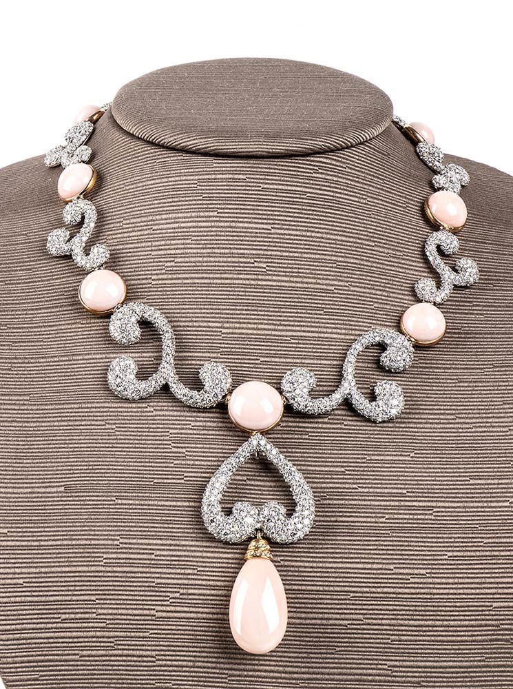 oro bianco ed oro giallo, 18K, con motivo di volute di nastri in pavé di diamanti e cabochon di corallo rosa (corallium secundum) con pendente centrale a goccia. Diamanti taglio brillante 30,43 ct circa, G-H, VVS-VS. Punzonato "750" e "1259 NA". Peso corallo cabochon 16,9 g. Dimensioni pendente centrale 6,7 x 3,5 cm., peso 6,5 g. Peso totale girocollo 115,4 g. Lunghezza 45 cm. Stato di conservazione: ***** eccellente.