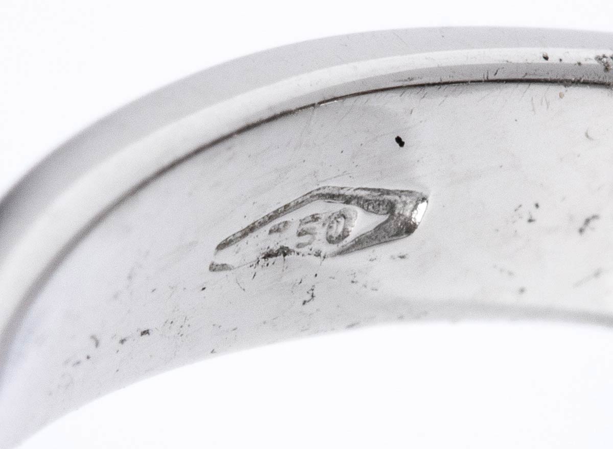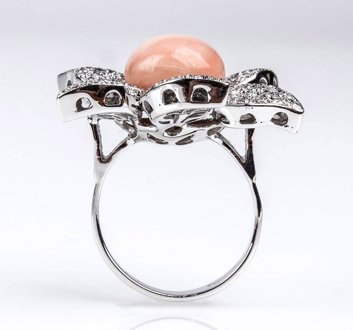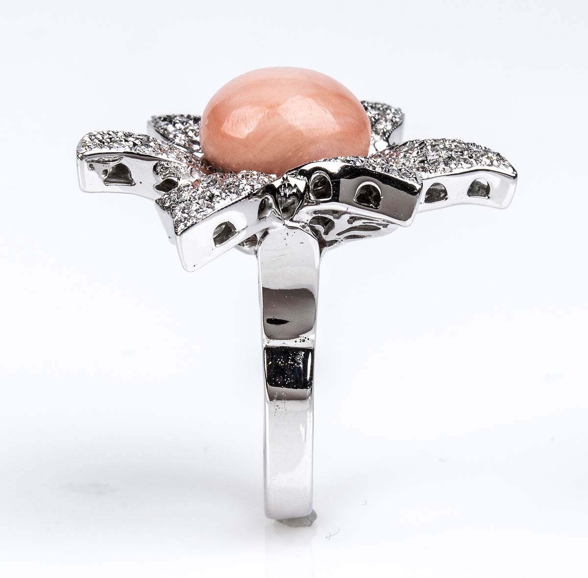 oro bianco 18k, modellato come un fiore, incastonato con cabochon di corallo Cerasuolo (corallium elatius), petali in pavé di diamanti taglio brillante 1,65 ct circa, G, VVS-VS. Punzonato "750". Dimensioni fronte 30 x 30 mm. Peso 13,2 g. Misura IT 16 - Misura US 7,5. Stato di conservazione: ***** eccellente.