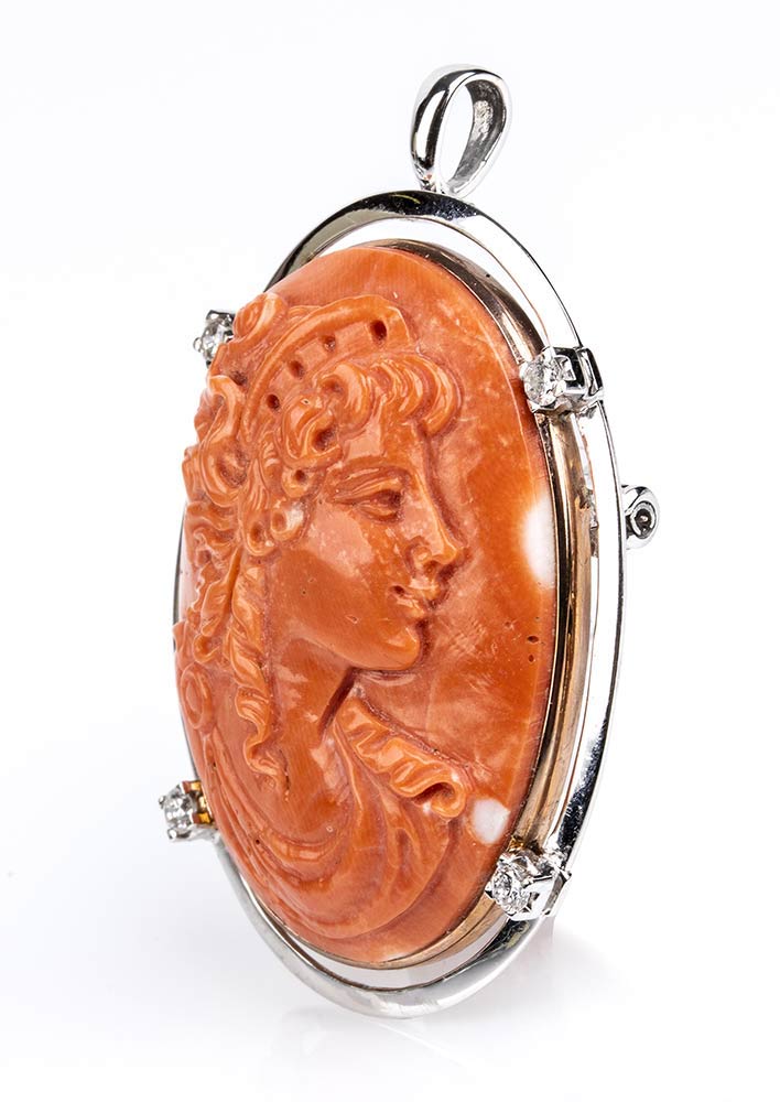 oro bianco 18k, di forma ovale, incastonato con cammeo scolpito in corallo Cerasuolo (corallium elatius) raffigurante un profilo femminile; dettagli in diamanti taglio brillante 0,33 ct circa, G, VVS-VS. Punzonato "750", "307 NA". Dimensioni 52 x 40 mm. Peso 22,2 g. Stato di conservazione: ***** eccellente.