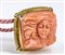 oro giallo 18k, di forma ovale, incastonata con cammeo scolpito in corallo Cerasuolo (corallium elatius) raffigurante un profilo femminile con capelli mossi; incastonata con diamanti neri 0,15 ct circa. Punzonato "750", "319 NA". Dimensioni 40 x 35 mm. Peso 33,7 g. Stato di conservazione: ***** eccellente.