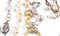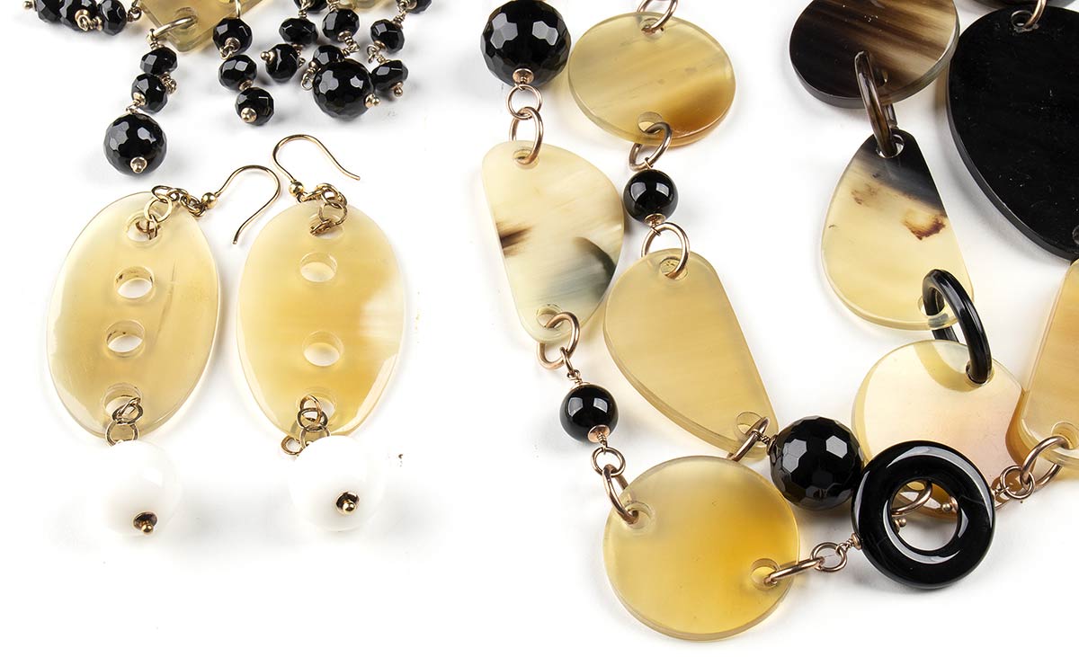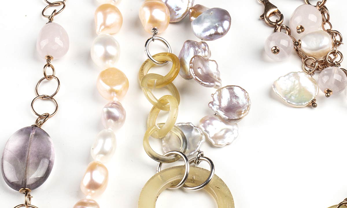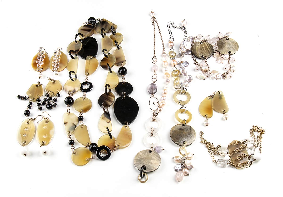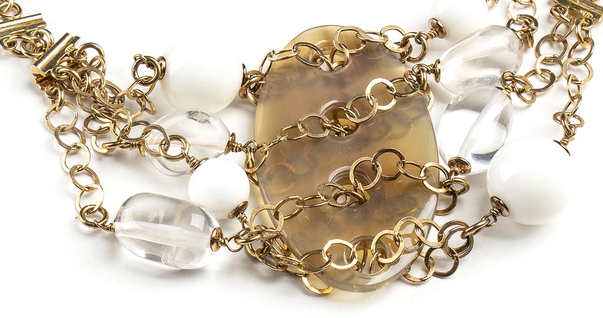 perle di fiume, corno, osso, amtetista, quarzo rosa, onice, cristallo di rocca. Montaggio in argento 925. Peso totale 484 gr. Stato di conservazione: ***** eccellente.