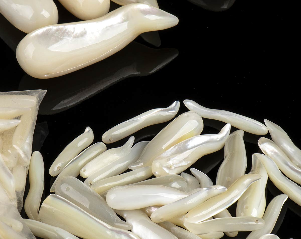 4 fili slegati di sfere in gradazione, diametro 11-15,5 cm, lunghezza 63 cm; 21 fili di semi di riso; lotti di corni scaramantici; lotto di cuori, cabochon ovali, dischi intagliati, fiori stilizzati e inserti per gioielli. Peso totale 1900 gr circa. Stato di conservazione: ***** eccellente.