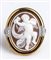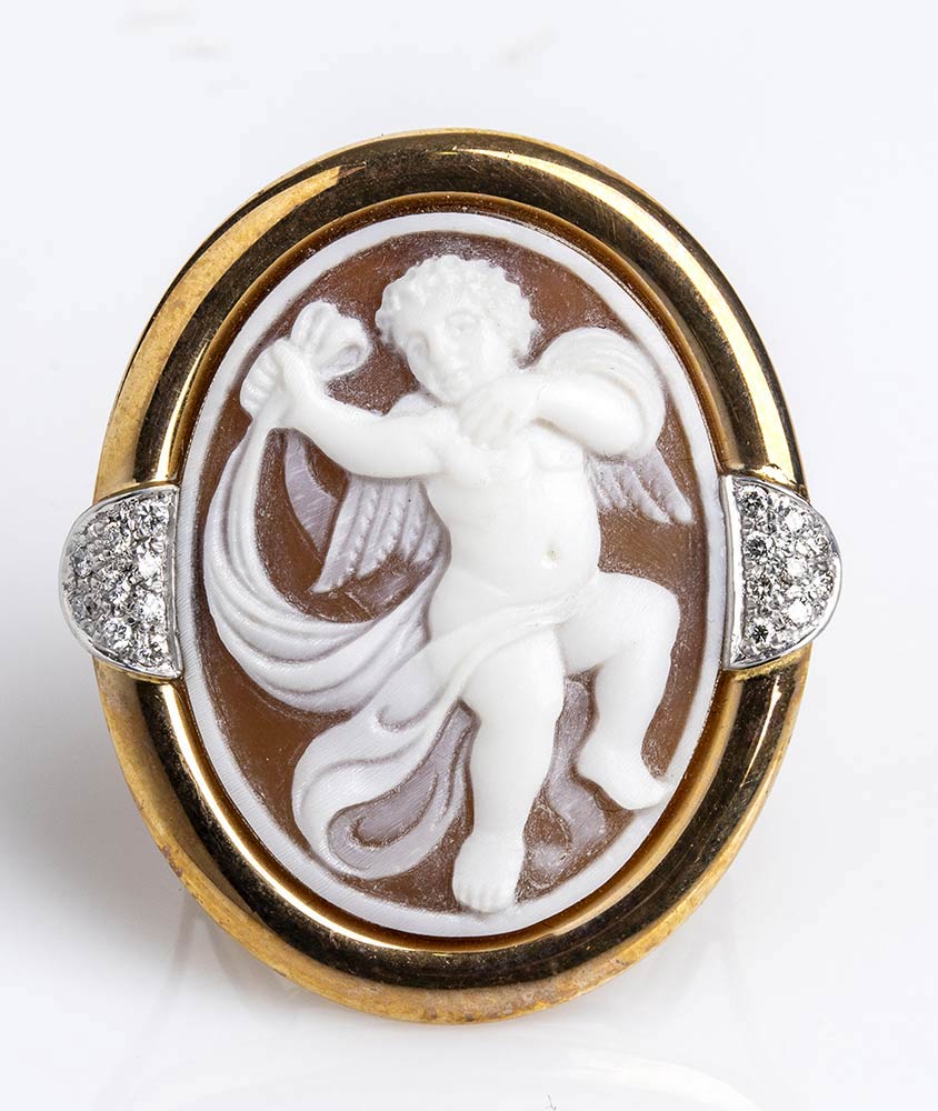 oro giallo ed oro bianco 14k, incastonato con cammeo scolpito su conchiglia sardonice raffigurante un amorino, dettagli in diamanti taglio brillante 0,12 ct circa, G, VS. Firmato "ROVIAN" e punzonato "750". Dimensioni fronte 35 x 25 mm. Peso 9 g. Stato di conservazione: ***** eccellente.
