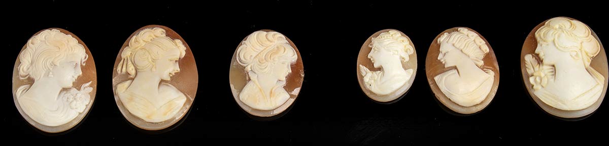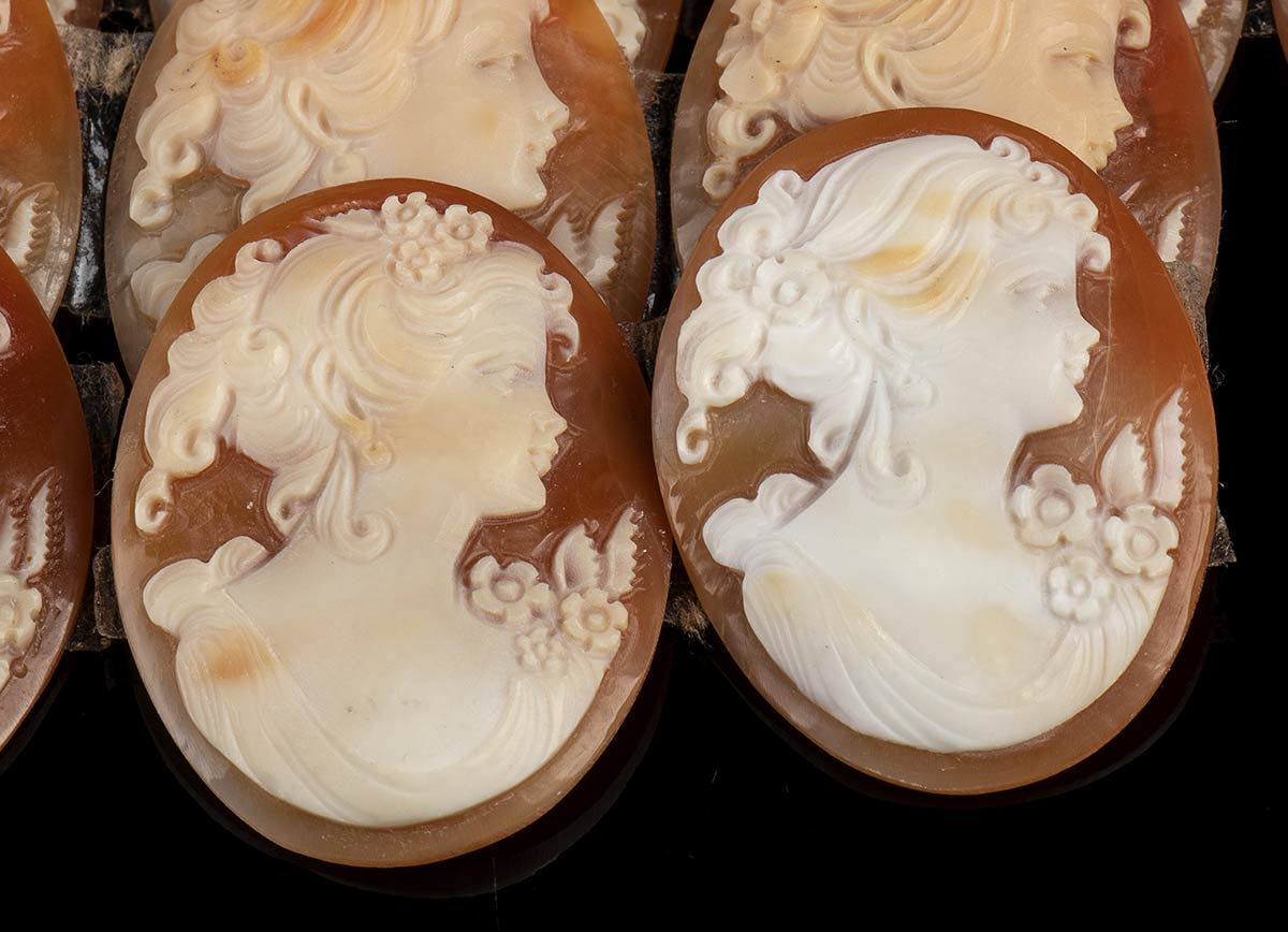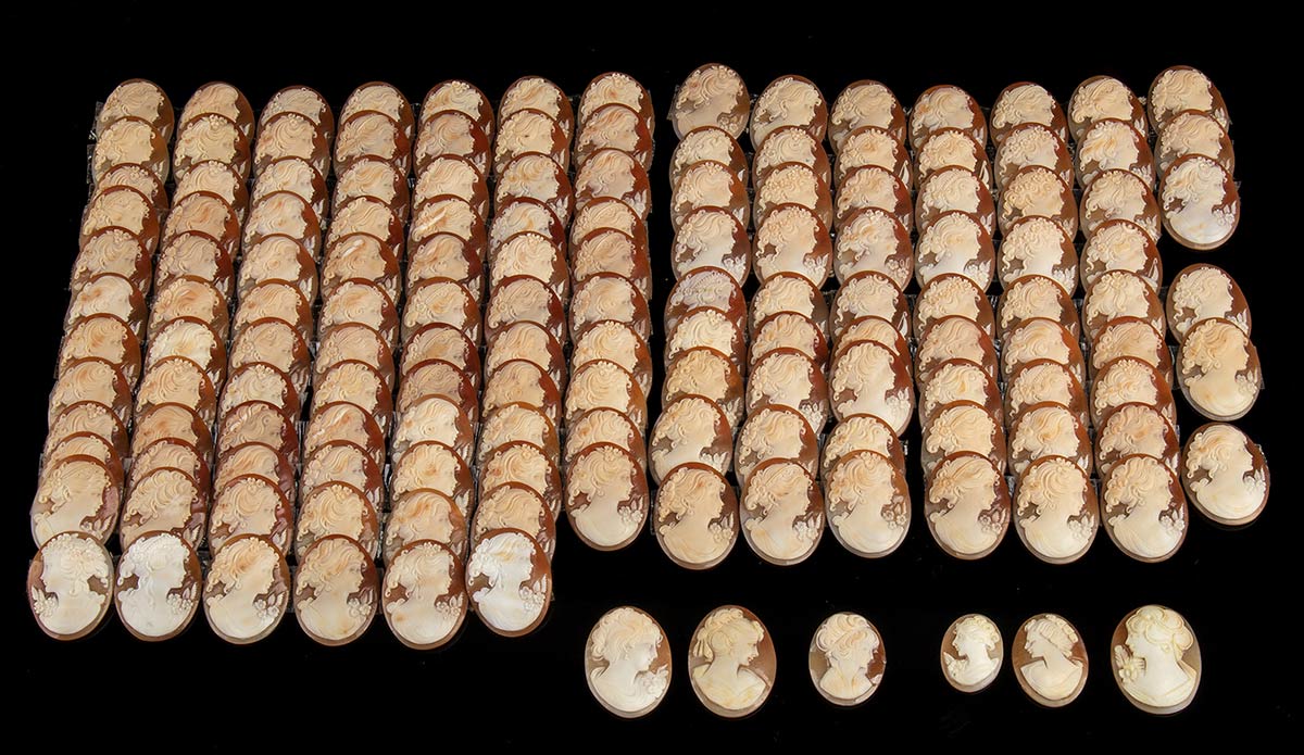 conchiglia sardonica (cassis Madagascarensis) raffiguranti profilo di donna volta a destra. 145 cammei dimensioni 35 x 27 mm; 2 cammei dimensioni 30 x 22mm; 1 cammeo dimensioni 25 x 20 mm. Peso totale 550 gr circa. Stato di conservazione: ***** eccellente.