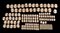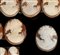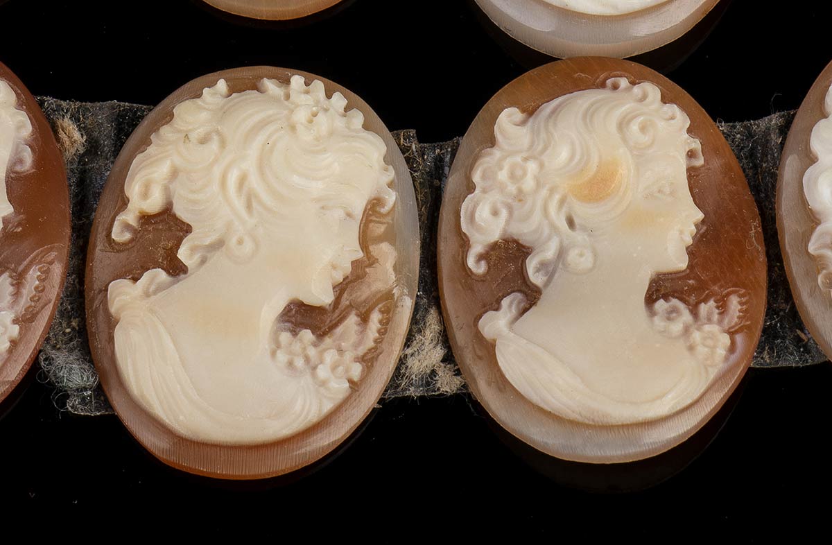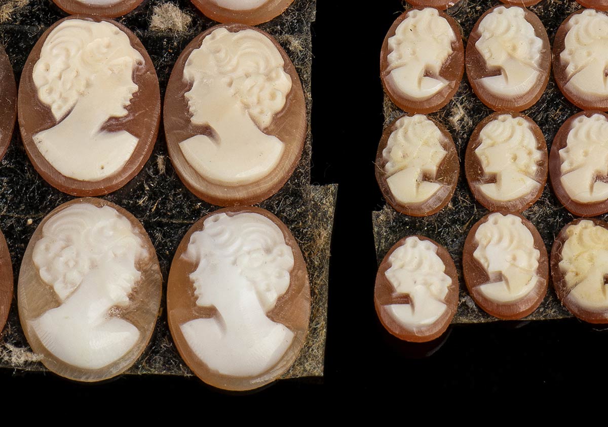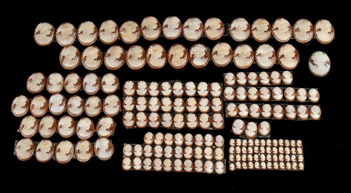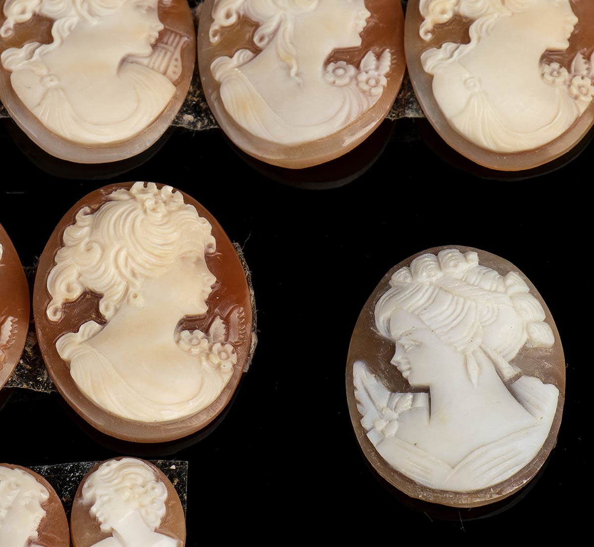 conchiglia sardonica (cassis Madagascarensis), raffiguranti profilo di donna volta a destra. 25 cammei dimensioni 30 x 22 mm; 21 cammei dimensioni 25 x 20 mm; 22 cammei dimensioni 16 x 12 mm; 24 cammei dimensioni 20 x 12 mm; 3 cammei dimensioni 19 x 12 mm; 28 cammei dimensioni 14 x 10 mm; 48 cammei dimensioni 9 x 6 mm; 1 cammeo dimensioni 30 x 23 mm. Stato di conservazione: ***** eccellente.