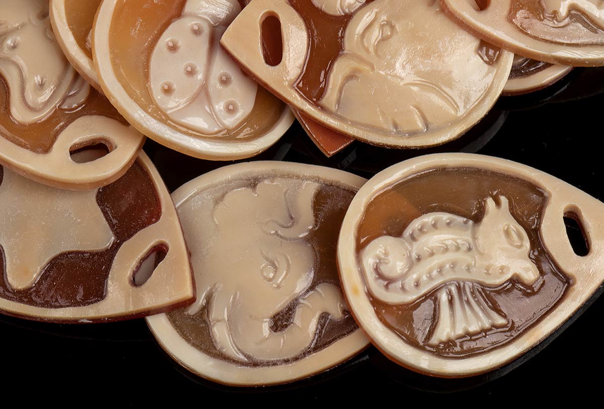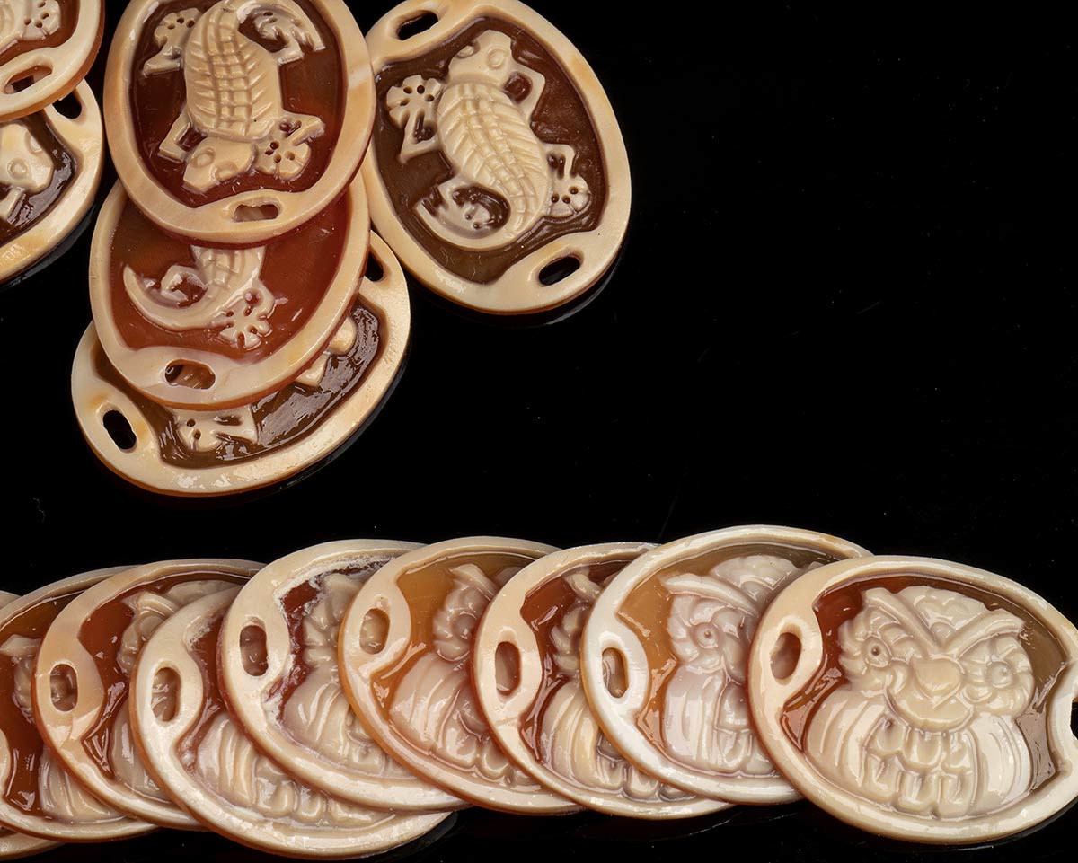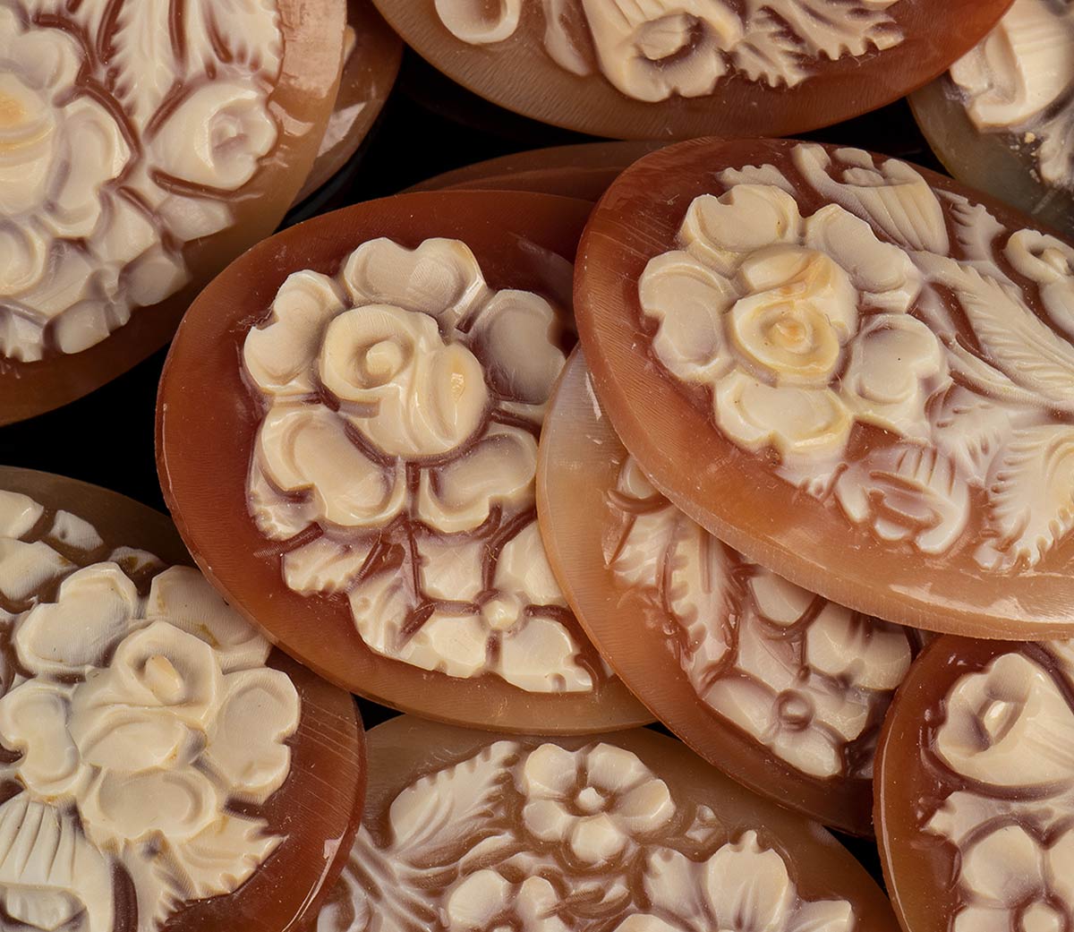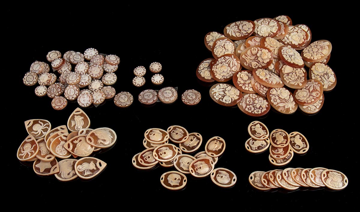 circa 120 cammei in conchiglia marina (famiglia Cassidae). Cammei a decoro floreale dimensioni 35 x 26 mm; cammei a forma di sole diametro 16 mm; cammei a forma di fiore diametro 13 mm; cammei a forma di fiore diametro 20 mm; cammei ovali dimensioni 25 x 16 mm con decori a civetta, coccodrillo e teschio; cammei per pendenti con decori vari dimensioni 30 x 23 mm. Peso totale 250 gr circa. Stato di conservazione: ***** eccellente.