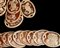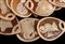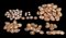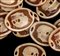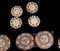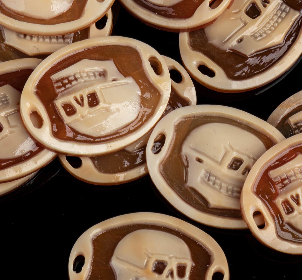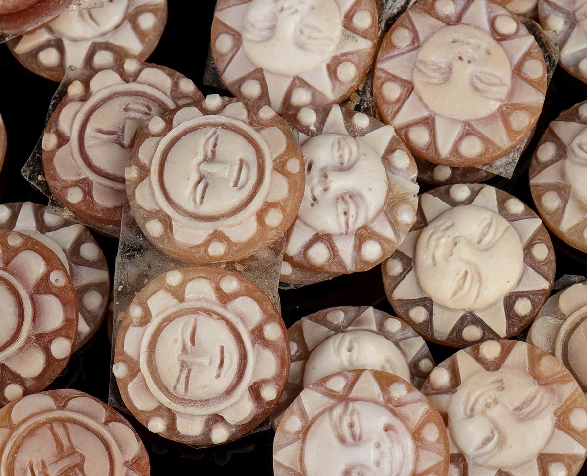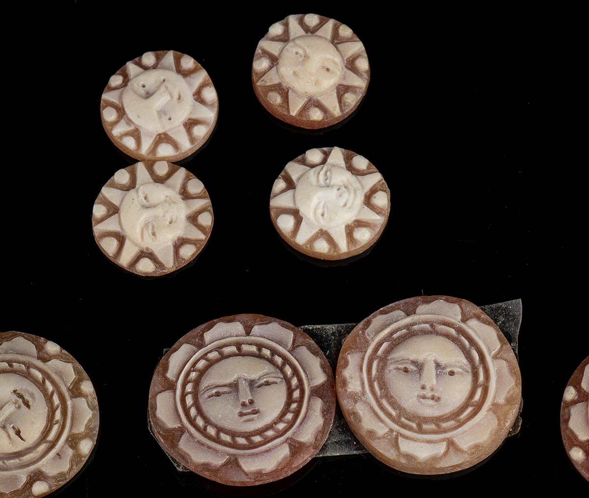 circa 120 cammei in conchiglia marina (famiglia Cassidae). Cammei a decoro floreale dimensioni 35 x 26 mm; cammei a forma di sole diametro 16 mm; cammei a forma di fiore diametro 13 mm; cammei a forma di fiore diametro 20 mm; cammei ovali dimensioni 25 x 16 mm con decori a civetta, coccodrillo e teschio; cammei per pendenti con decori vari dimensioni 30 x 23 mm. Peso totale 250 gr circa. Stato di conservazione: ***** eccellente.
