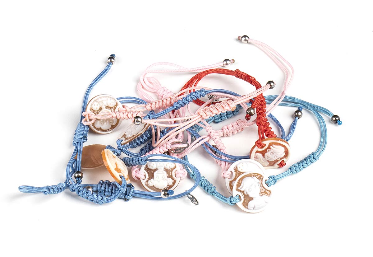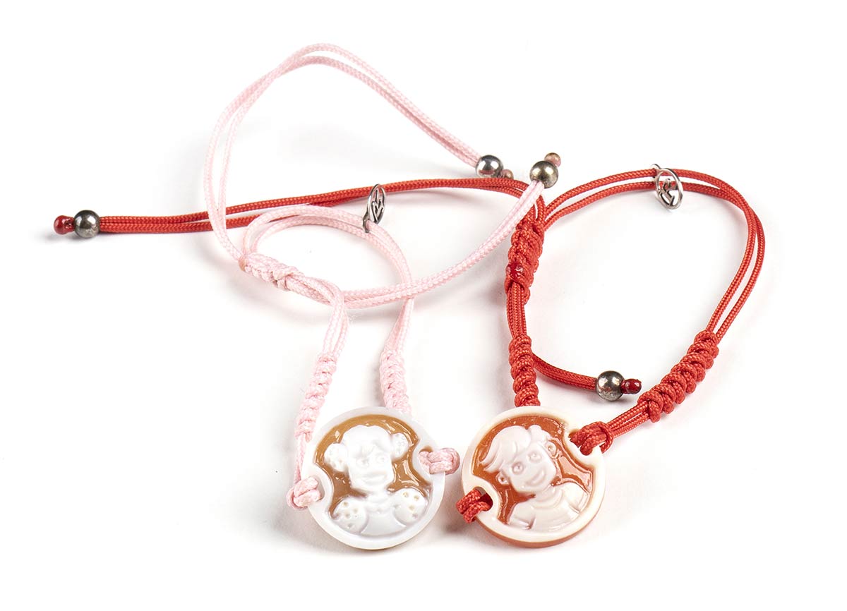 bracciali con cordino marino, conchiglia marina (Cassis Madagascarensis) ed argento. Diametro cammei 19 mm. Peso totale 18 gr circa. Stato di conservazione: ***** eccellente.