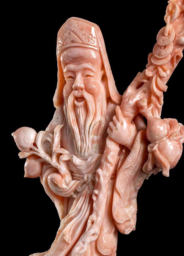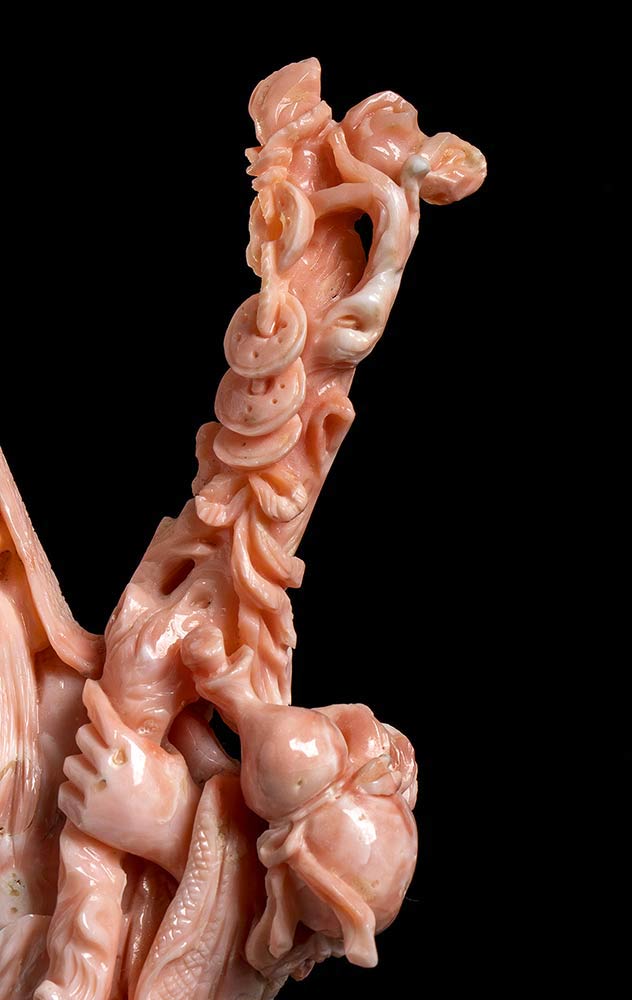(corallium elatius) raffigurante un saggio con un bastone nodoso nella mano destra e una grande pesca in quella sinistra, simbolo di longevità, con un bambino. Base lignea. Dimensioni scultura 23 x 17 x 4.5 cm, base 3,3 x 18 x 8,5 cm. Peso scultura 577,3 g. Stato di conservazione: ***** eccellente.