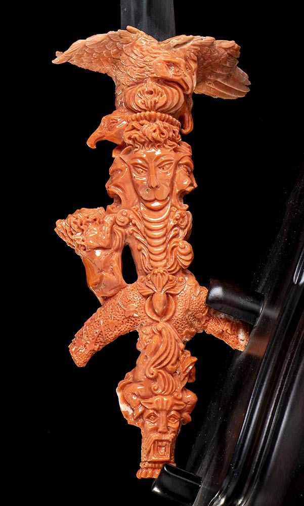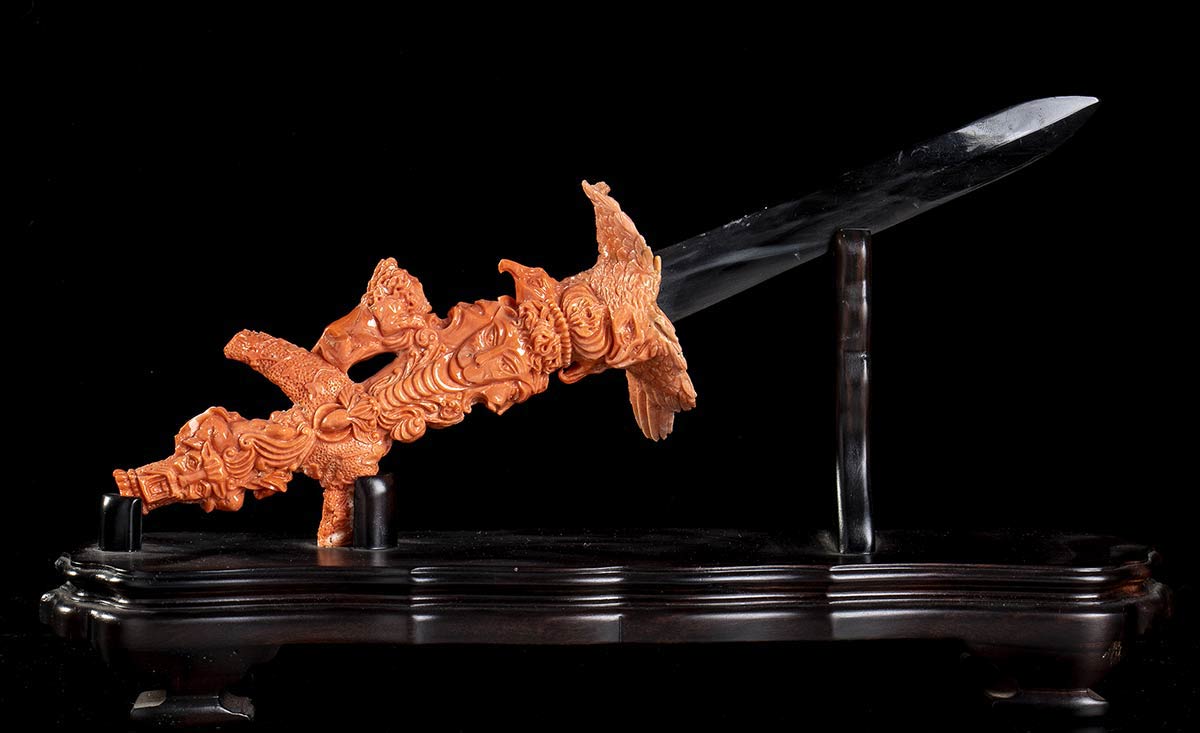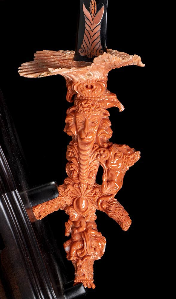 (corallium elatius) raffigurante un pugnale posto su una base lignea; lama in materiale plastico. Lunghezza 30 cm, lama 16 x 9 x 6,5 cm, base 14 x 32 x 6 cm. Peso pugnale 180,3 gr, peso base 546 gr. Stato di conservazione: ***** eccellente.