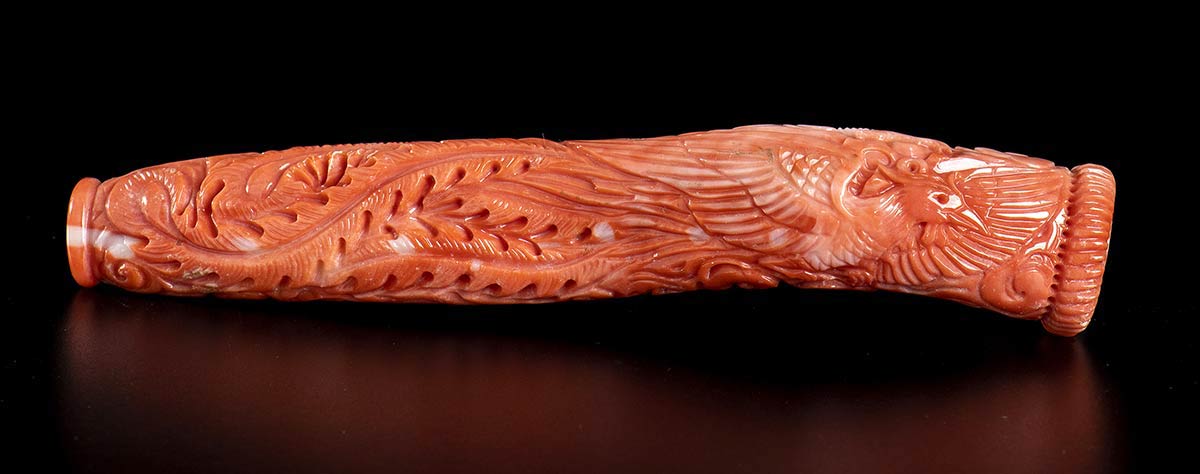 (corallium elatius) raffigurante un bocchino per sigaretta posto su una base lignea. Dimensioni scultura 11,7 x 1,8 x 1,5 cm, base 7 x 12,5 x 5 cm. Peso scultura 50,6 gr. Stato di conservazione: ***** eccellente.