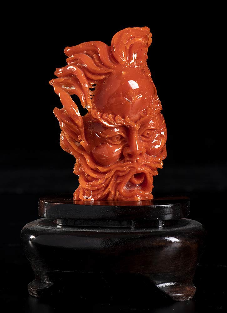 (corallium elatius) raffigurante una maschera posta su una base lignea. Dimensioni scultura 6 x 3,7 x 3,2 cm, base 3 x 6 x 4,3 cm. Peso scultura 45,1 gr. Stato di conservazione: ***** eccellente.