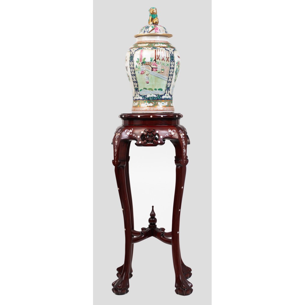 CANTONE in legno di mogano con tarsie in madreperla e potiche in ceramica decorata.