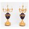 COPPIA CANDELABRI a cinque fiamme in bronzo dorato e ceramica nei toni del blu.