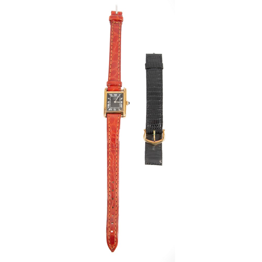 OROLOGIO Cartier da donna modello tank in argento 925 e placcato oro g 20 m, movimento al quarzo, cinturino originale in pelle nera (usure).