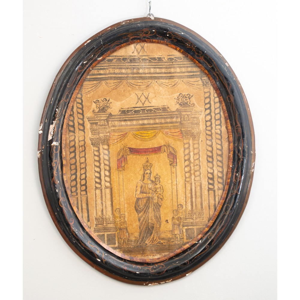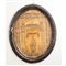 Madonna con bambino con tempietto entro cornice di forma ovale in legno laccato e decorato (usure).