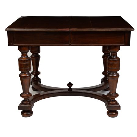 TAVOLO in legno di noce di forma quadrata con due allunghi.