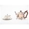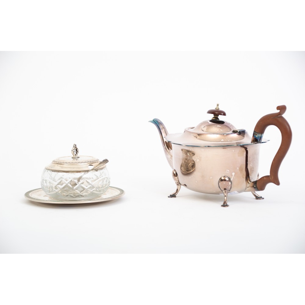 Theiera in sheffield con manico e pomolo in legno e formaggera con piattino, coperchio e cucchiaino in argento.