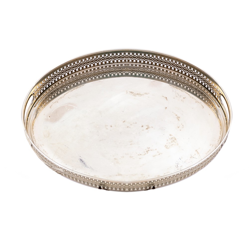 VASSOIO di forma ovale in argento con fondo liscio e ringhiera traforata. Argentiere Greggio- Padova (g. 450) (usure).